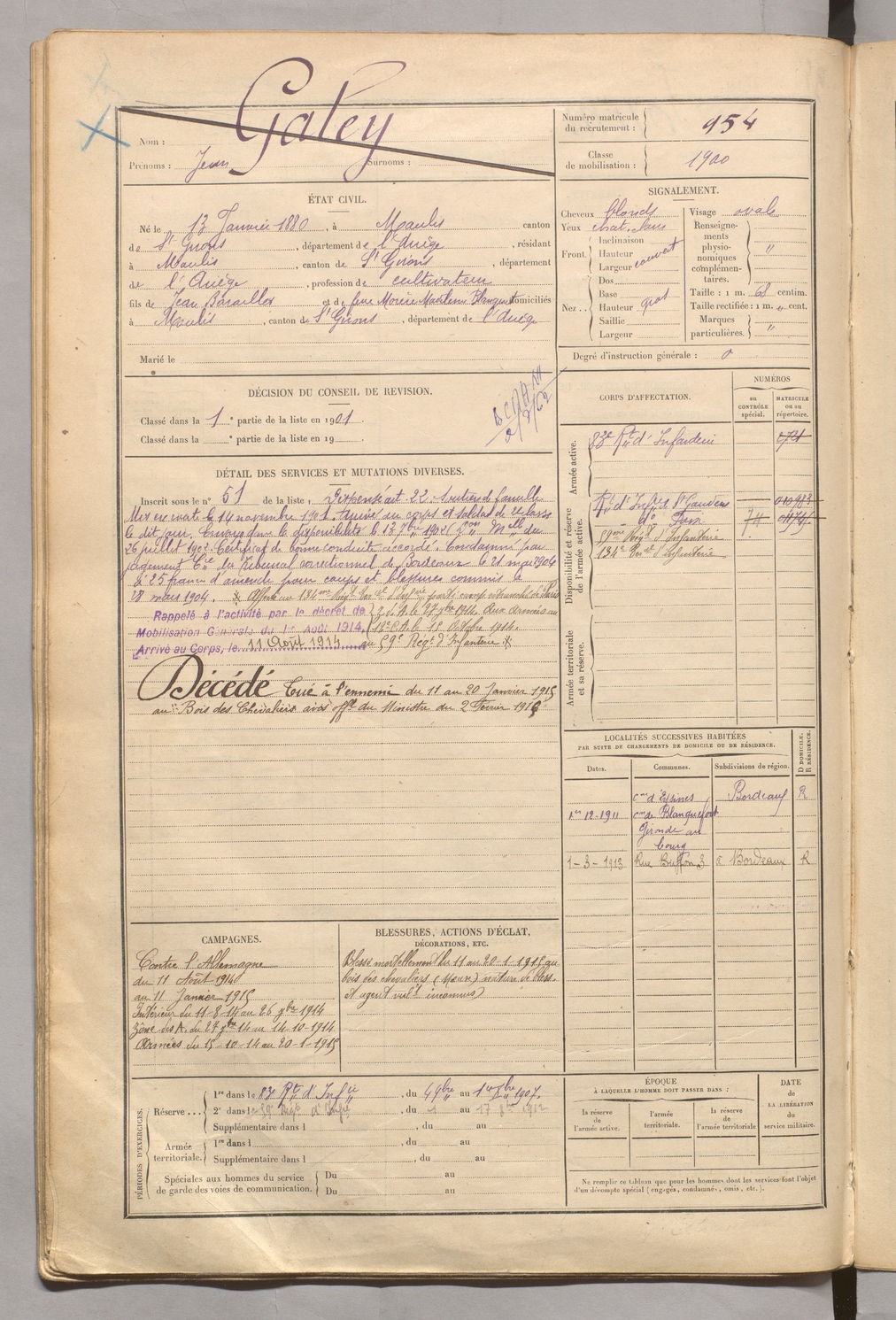 | Galey | Jean | FOIX | 129 W 5 | 1900 | Moulis | Moulis | 954 |