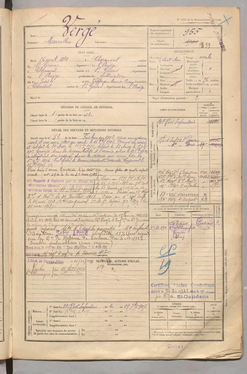 | Vergé | Marcellin | FOIX | 129 W 5 | 1900 | Clermont | Clermont | 955 |