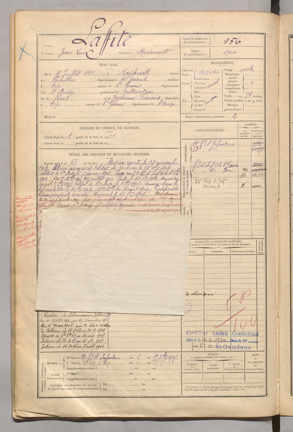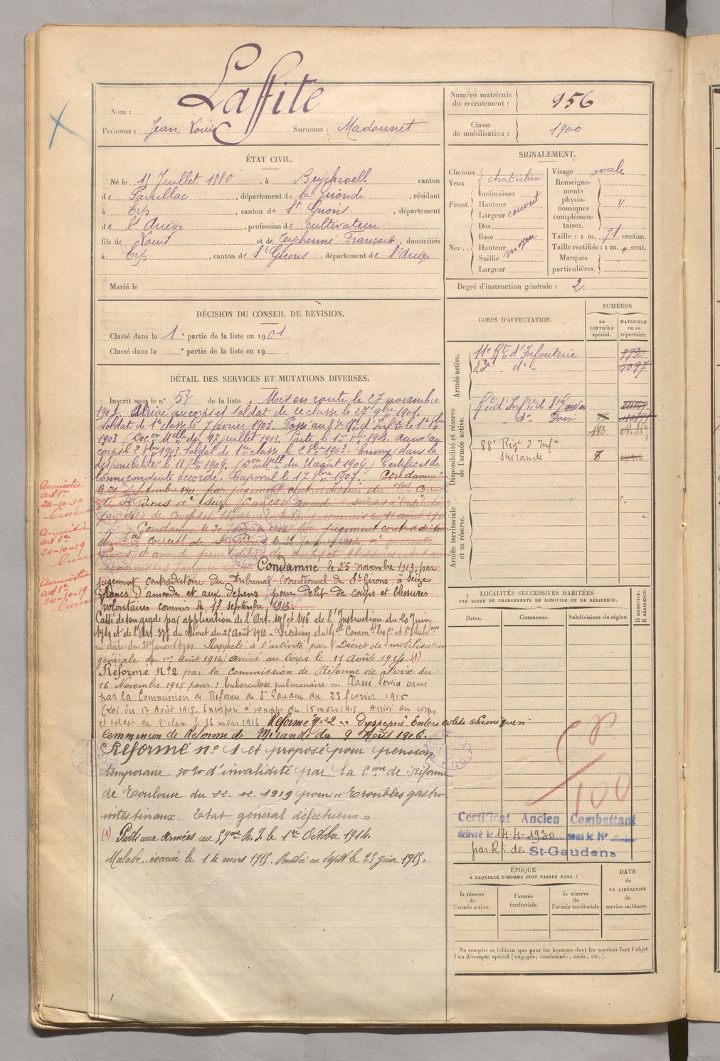 | Laffite | Jean Louis dit Madounet | FOIX | 129 W 5 | 1900 | Beychevell | Erp | 956 |
