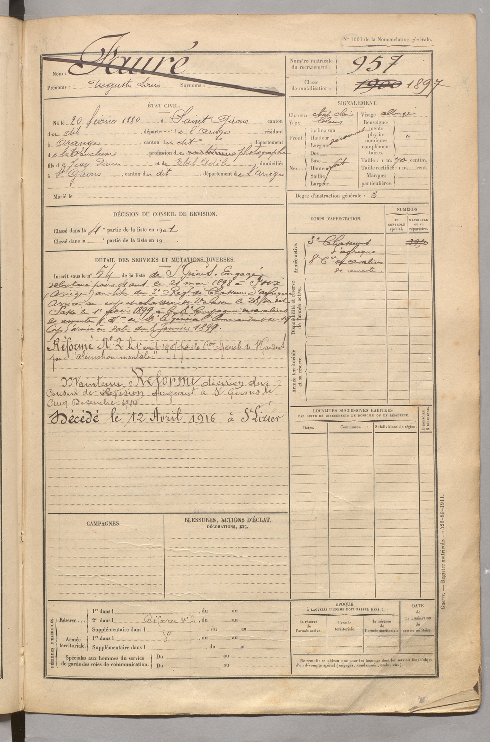| Fauré | Auguste Louis | FOIX | 129 W 5 | 1900 | Saint-Girons | Orange | 957 |