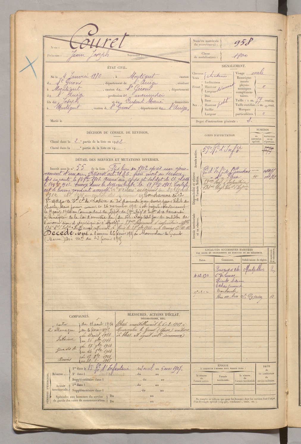 | Couret | Jean Joseph | FOIX | 129 W 5 | 1900 | Montégut-en-Couserans | Montégut-en-Couserans | 958 |