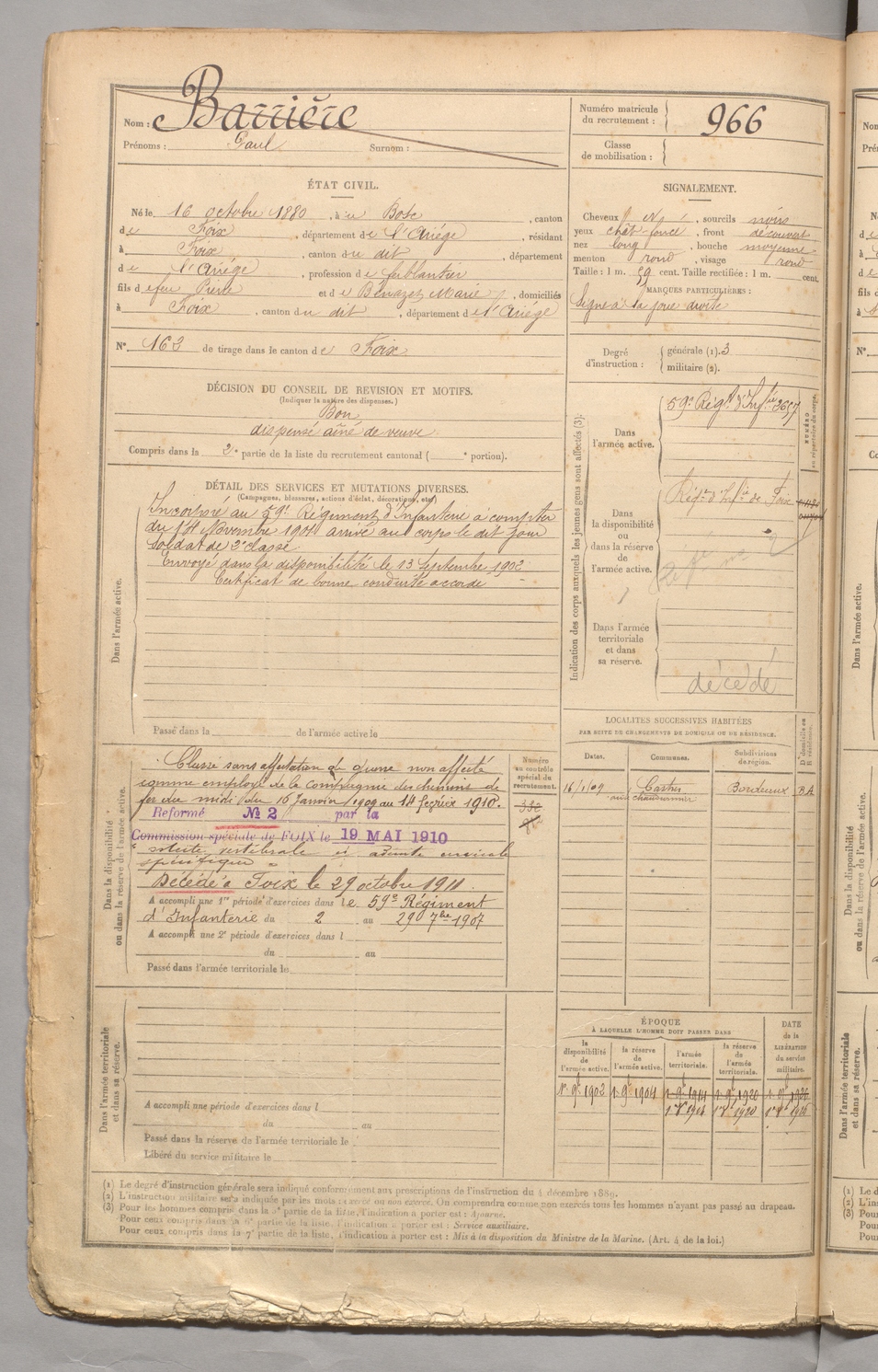 | Barrière | Paul | FOIX | 129 W 3 | 1900 | Bosc (Le) | Foix | 966 |