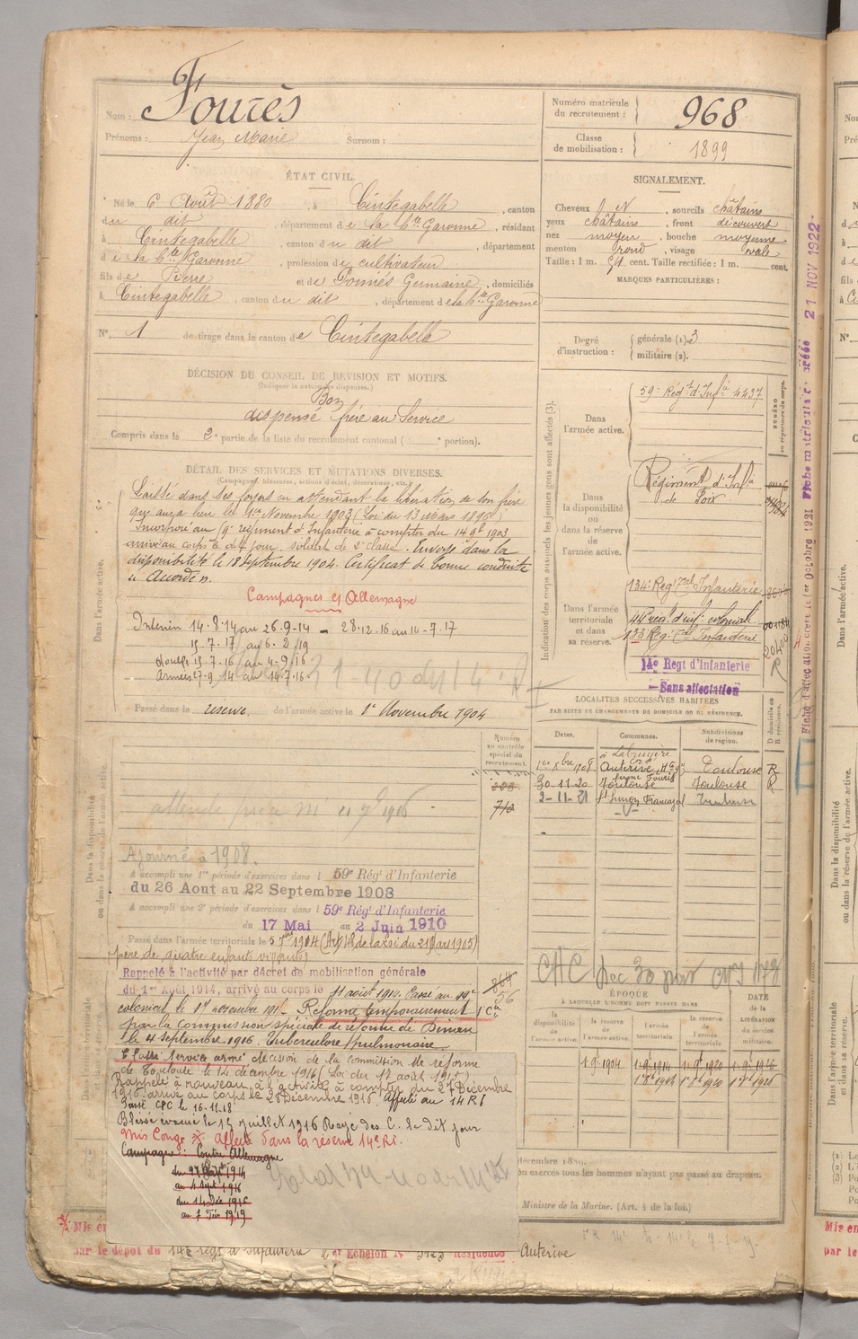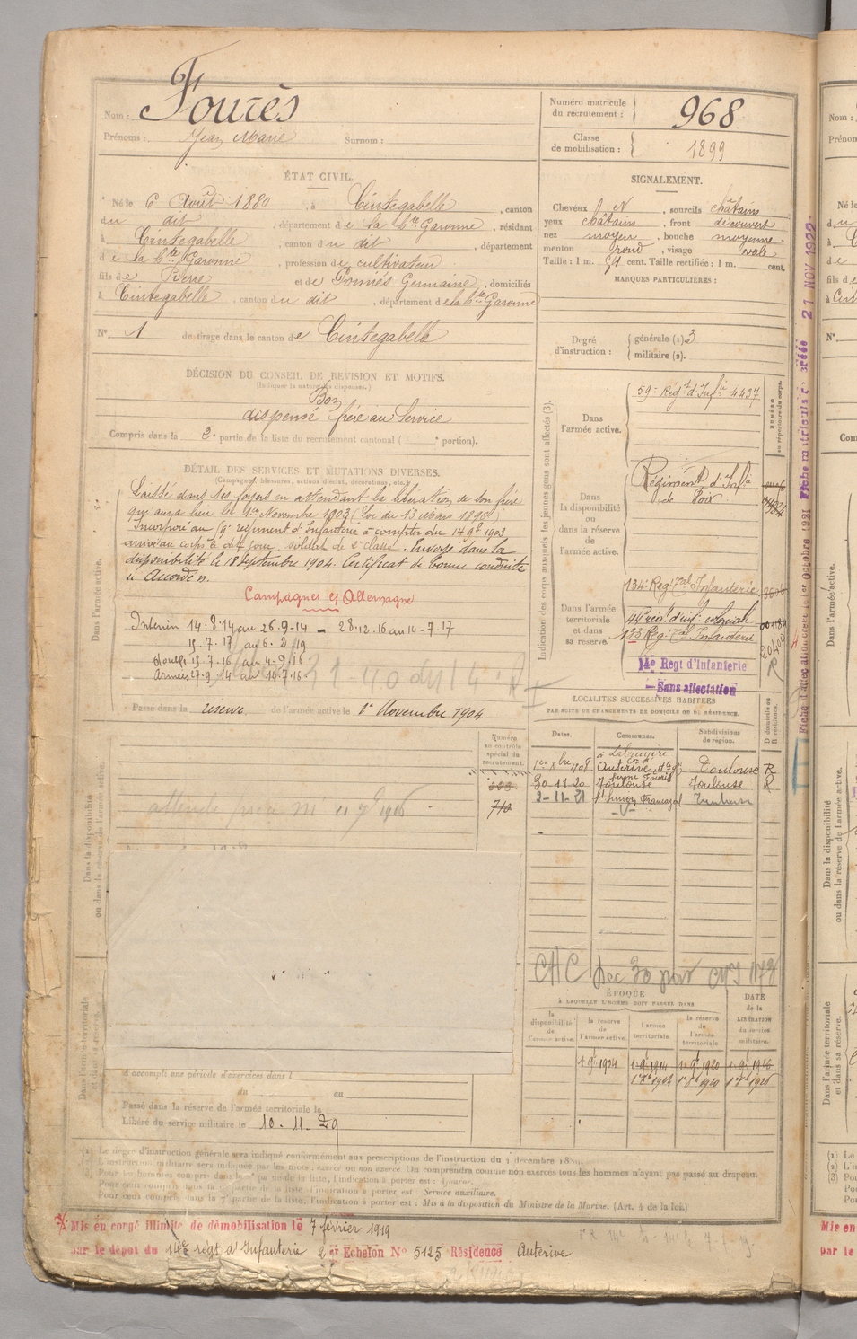 | Fourès | Jean Marie | FOIX | 129 W 3 | 1900 | Cintegabelle | Cintegabelle | 968 |