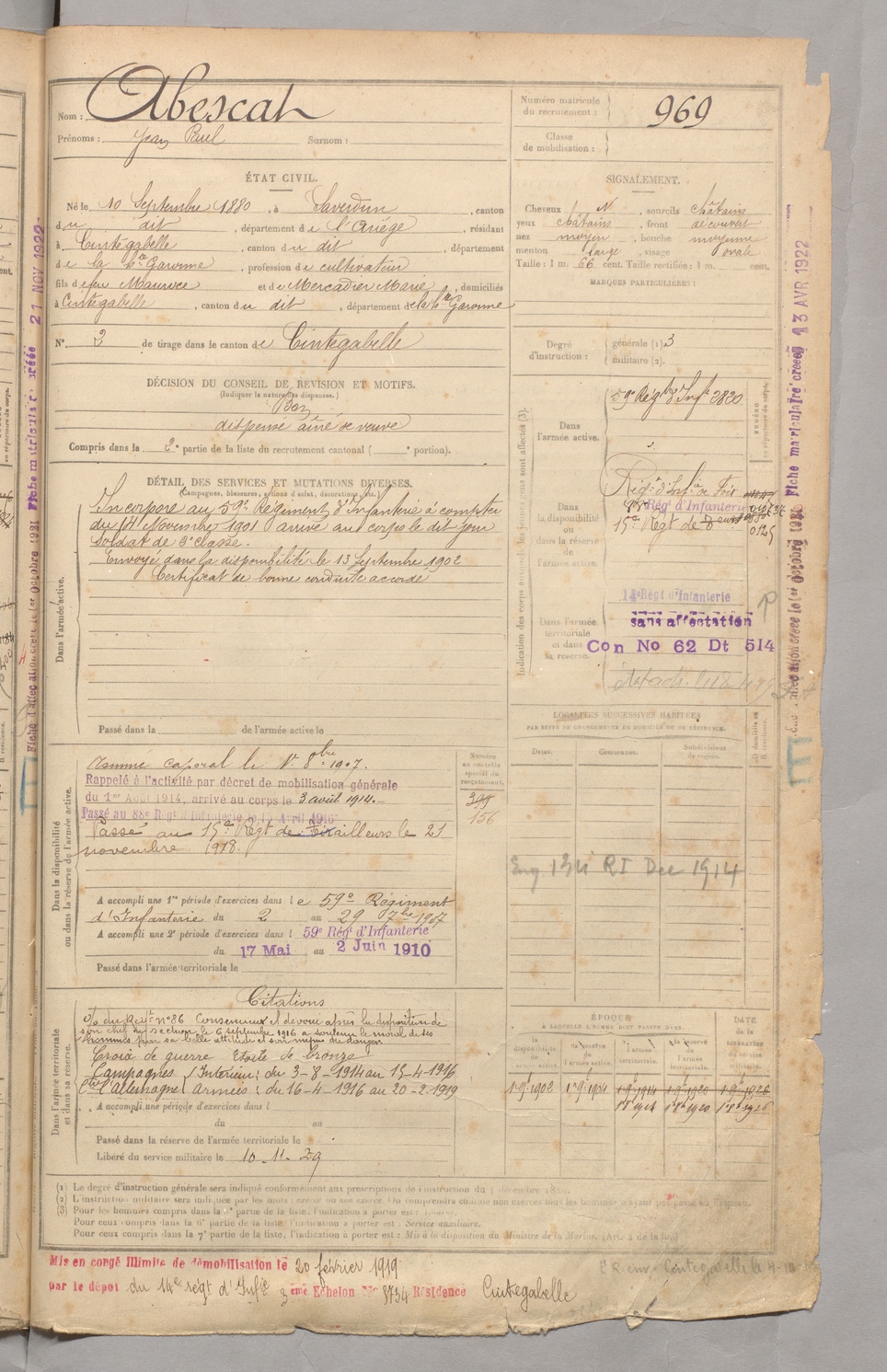 | Abescat | Jean Paul | FOIX | 129 W 3 | 1900 | Saverdun | Cintegabelle | 969 |