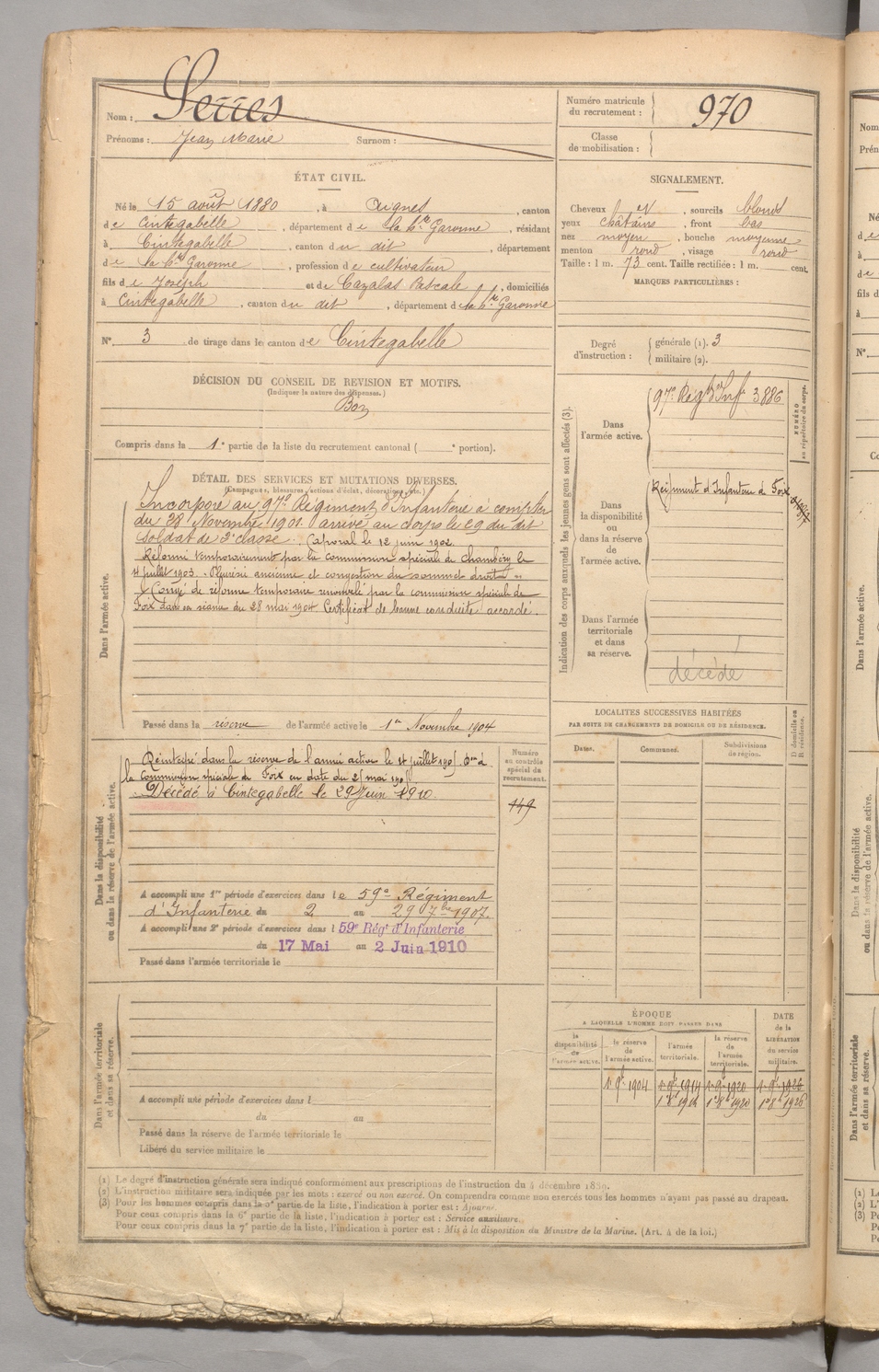 | Serres | Jean Marie | FOIX | 129 W 3 | 1900 | Aignes | Cintegabelle | 970 |