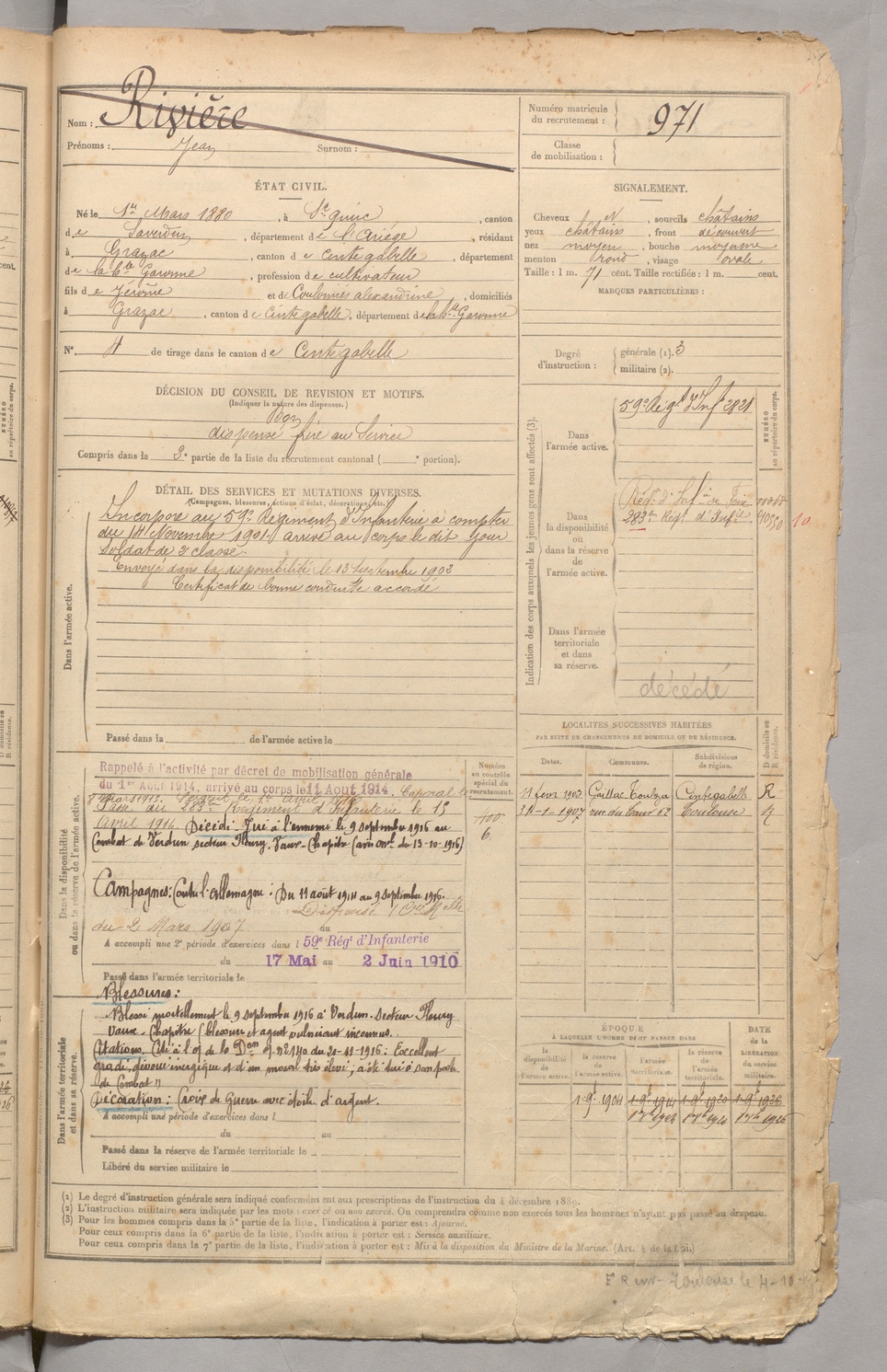 | Rivière | Jean | FOIX | 129 W 3 | 1900 | Saint-Quirc | Grazac | 971 |