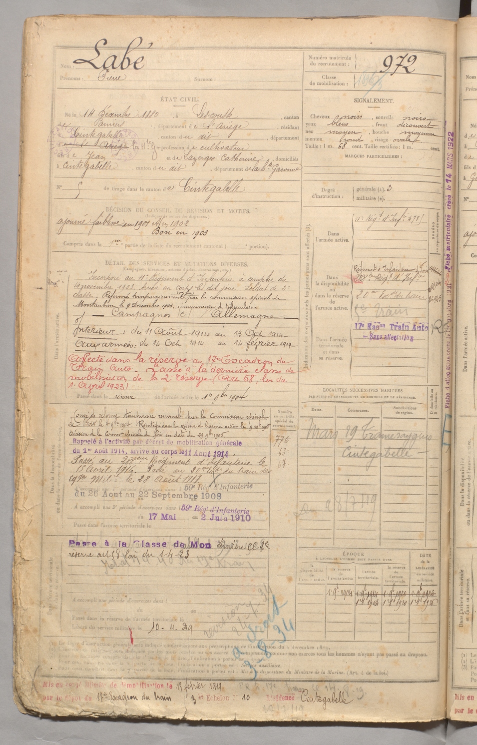 | Labé | Pierre | FOIX | 129 W 3 | 1900 | Lescousse | Cintegabelle | 972 |