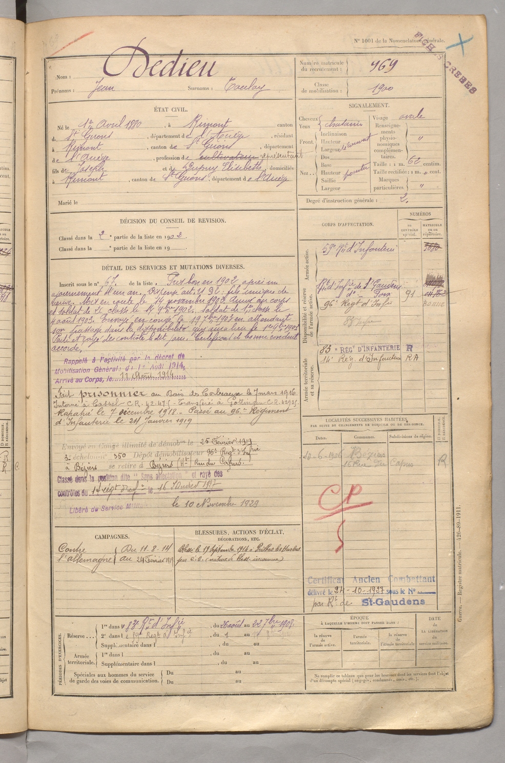 | Dedieu | Jean dit Coulay | FOIX | 129 W 5 | 1900 | Rimont | Rimont | 969 |