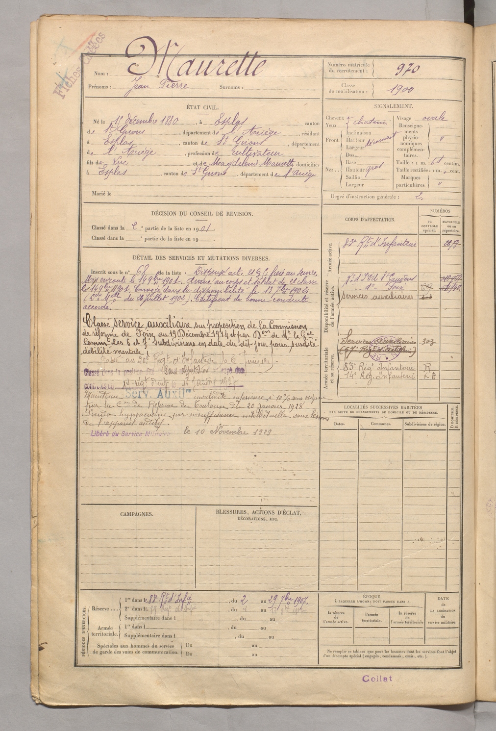| Maurette | Jean Pierre | FOIX | 129 W 5 | 1900 | Esplas-de-Sérou | Esplas-de-Sérou | 970 |