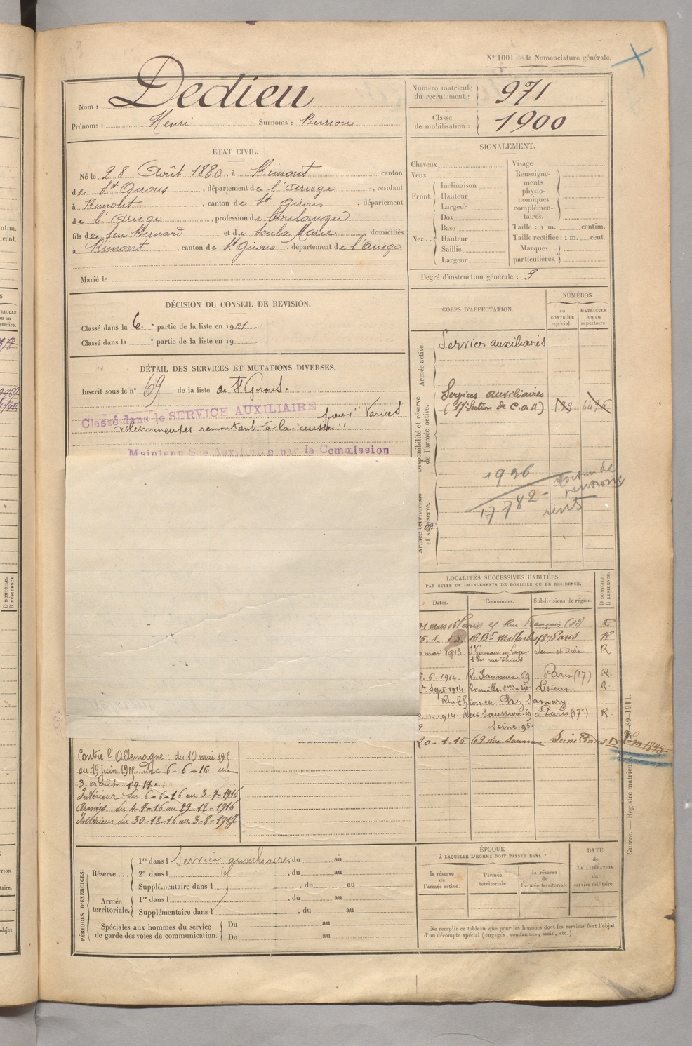 | Dedieu | Henri dit Bernou | FOIX | 129 W 5 | 1900 | Rimont | Rimont | 971 |