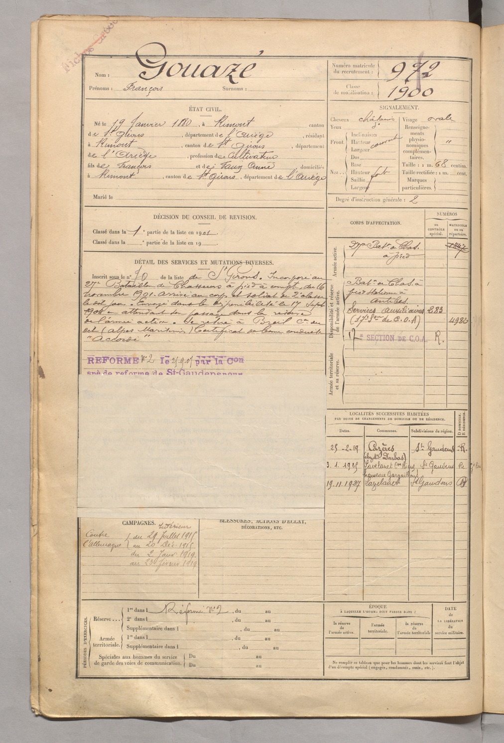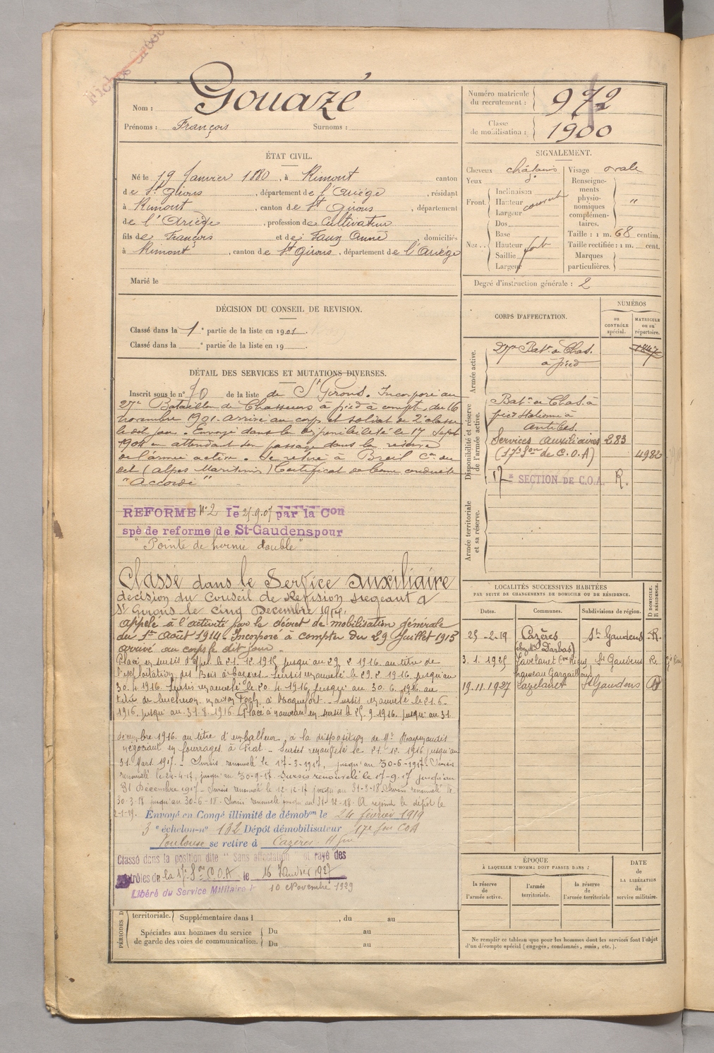 | Gouazé | François | FOIX | 129 W 5 | 1900 | Rimont | Rimont | 972 |