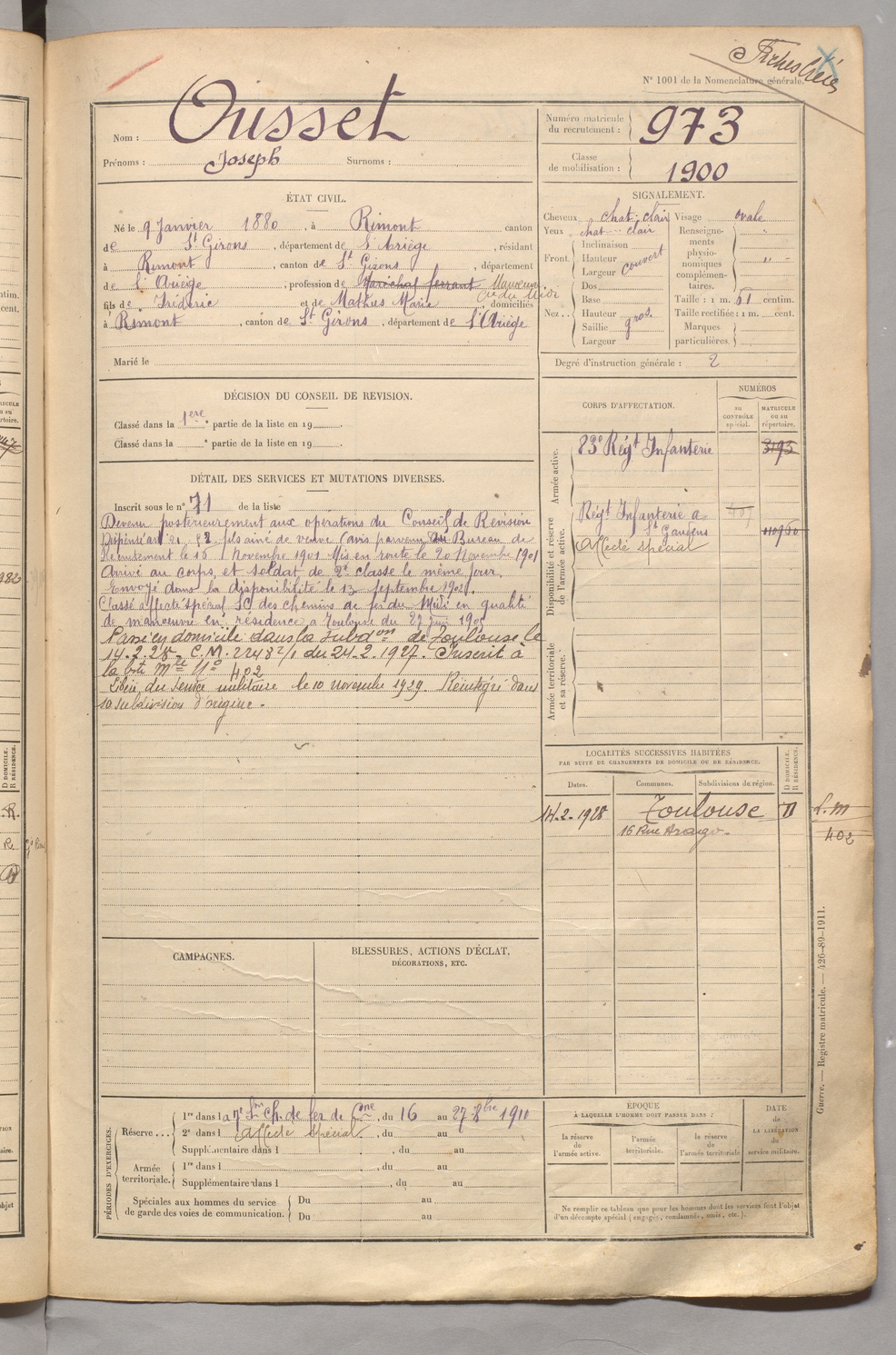 | Ousset | Joseph | FOIX | 129 W 5 | 1900 | Rimont | Rimont | 973 |