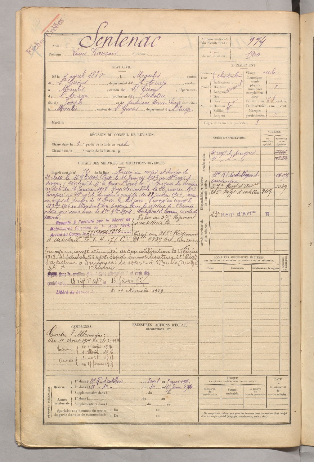 | Sentenac | Louis François | FOIX | 129 W 5 | 1900 | Moulis | Moulis | 974 |