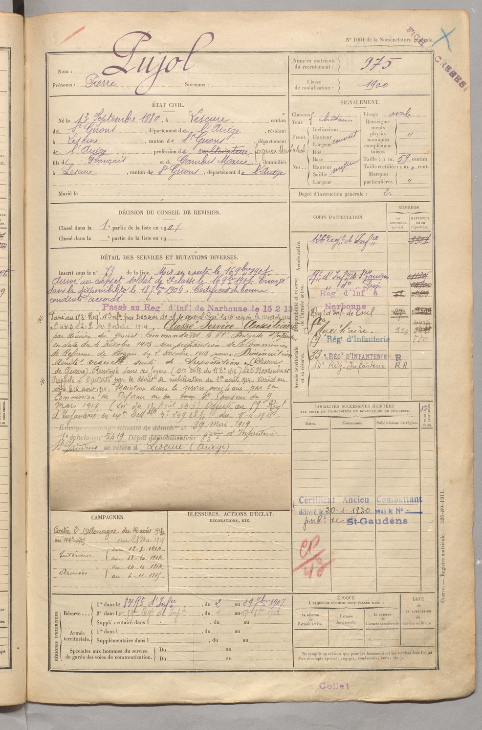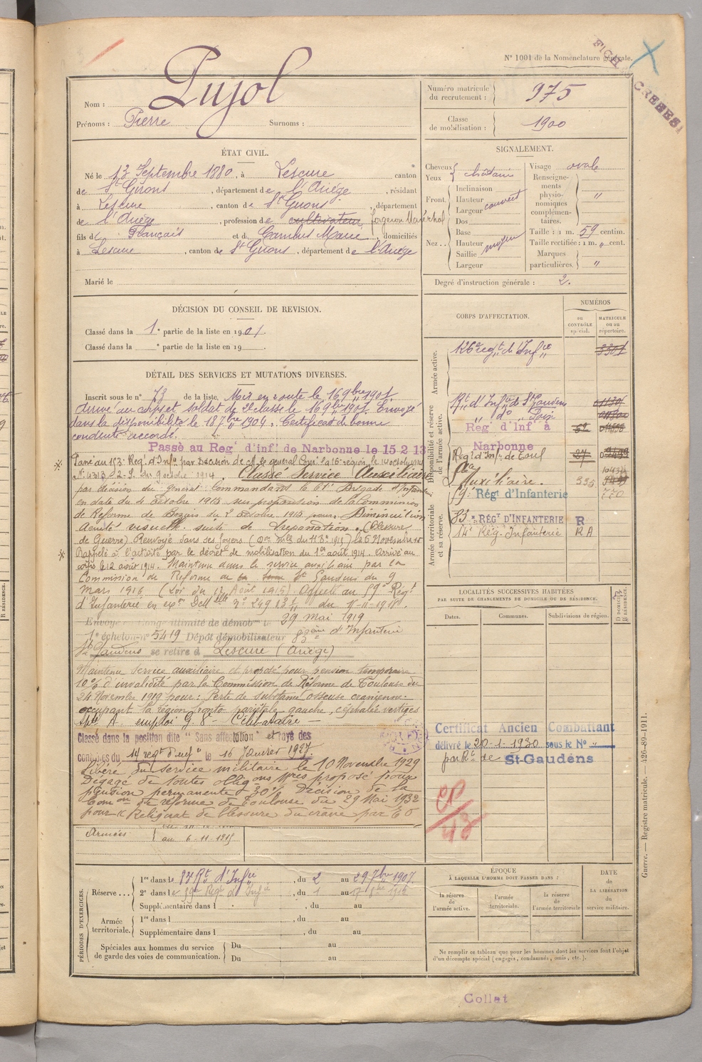 | Pujol | Pierre | FOIX | 129 W 5 | 1900 | Lescure | Lescure | 975 |
