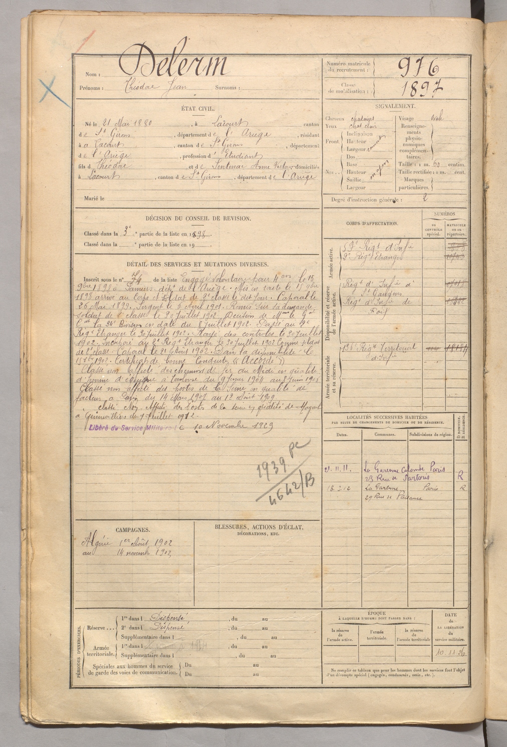| Delerm | Théodore Jean | FOIX | 129 W 5 | 1900 | Lacourt | Lacourt | 976 |