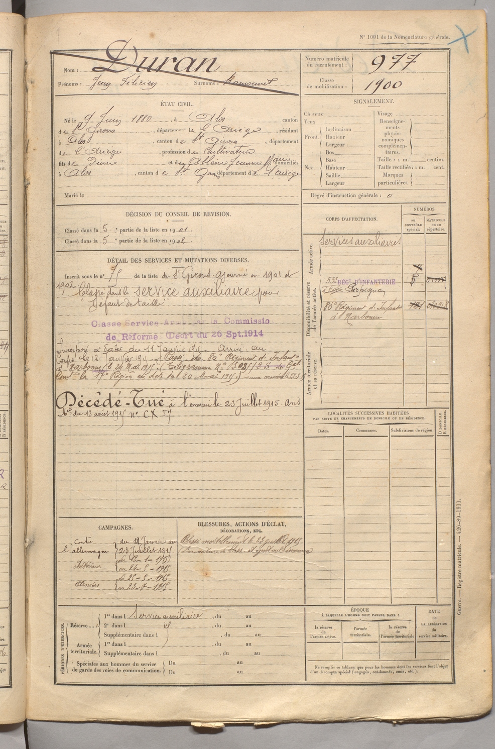 | Duran | Jean Félicien dit Ramounet | FOIX | 129 W 5 | 1900 | Alos | Alos | 977 |