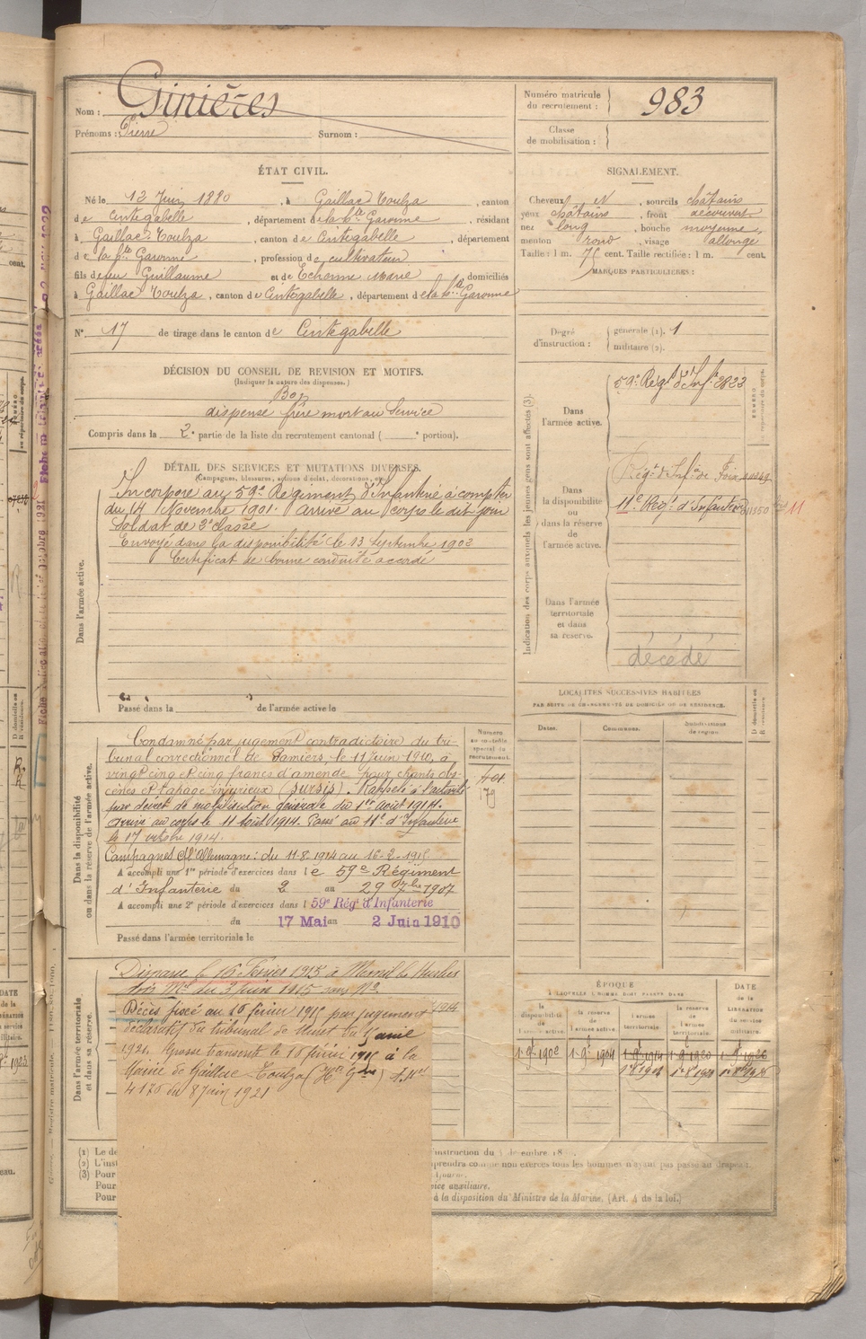 | Ginières | Pierre | FOIX | 129 W 3 | 1900 | Gaillac-Toulza | Gaillac-Toulza | 983 |