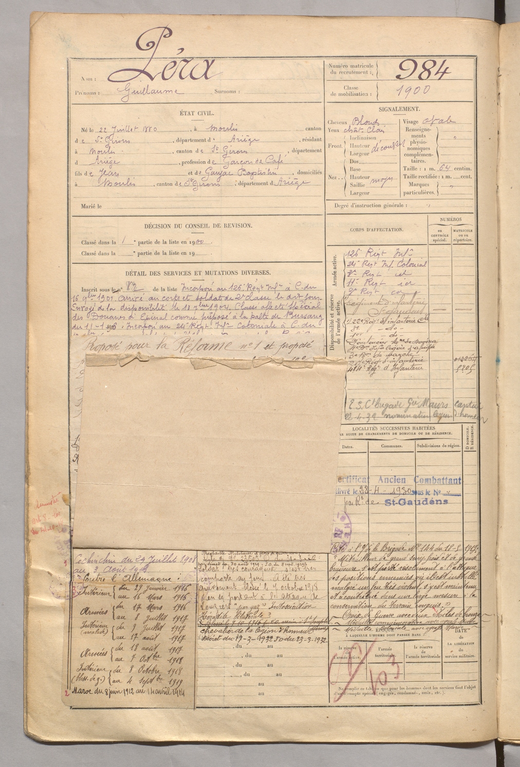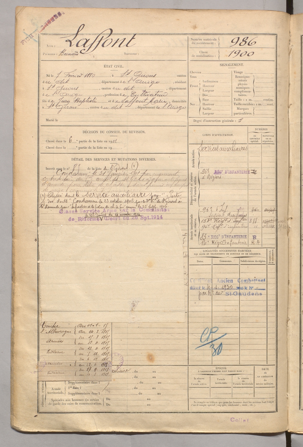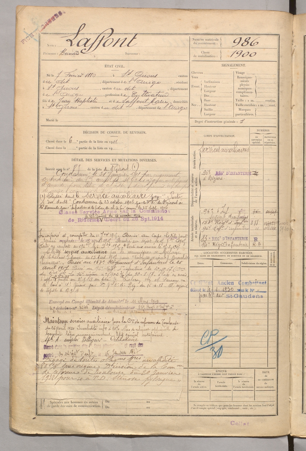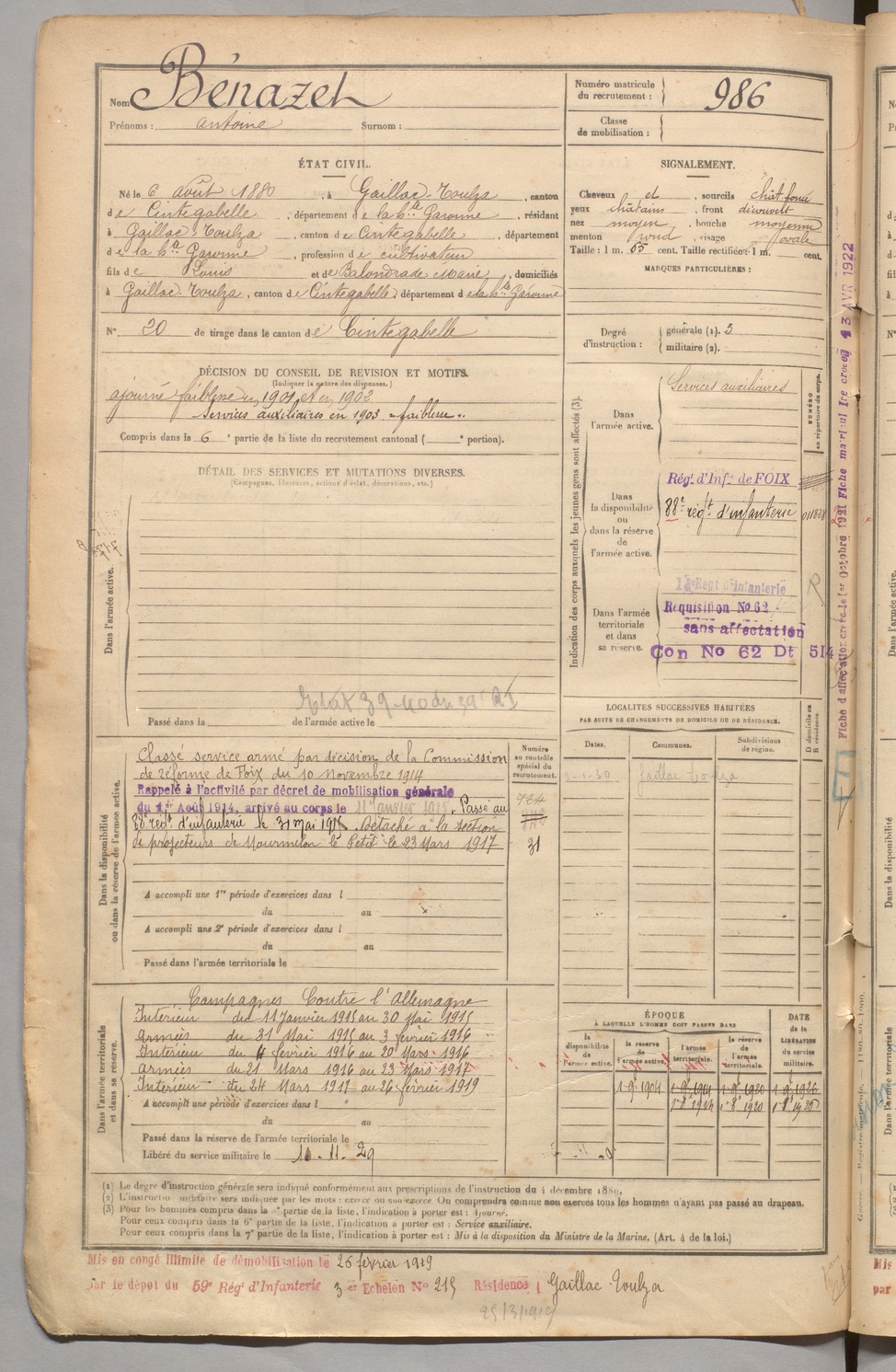 | Bénazet | Antoine | FOIX | 129 W 3 | 1900 | Gaillac-Toulza | Gaillac-Toulza | 986 |