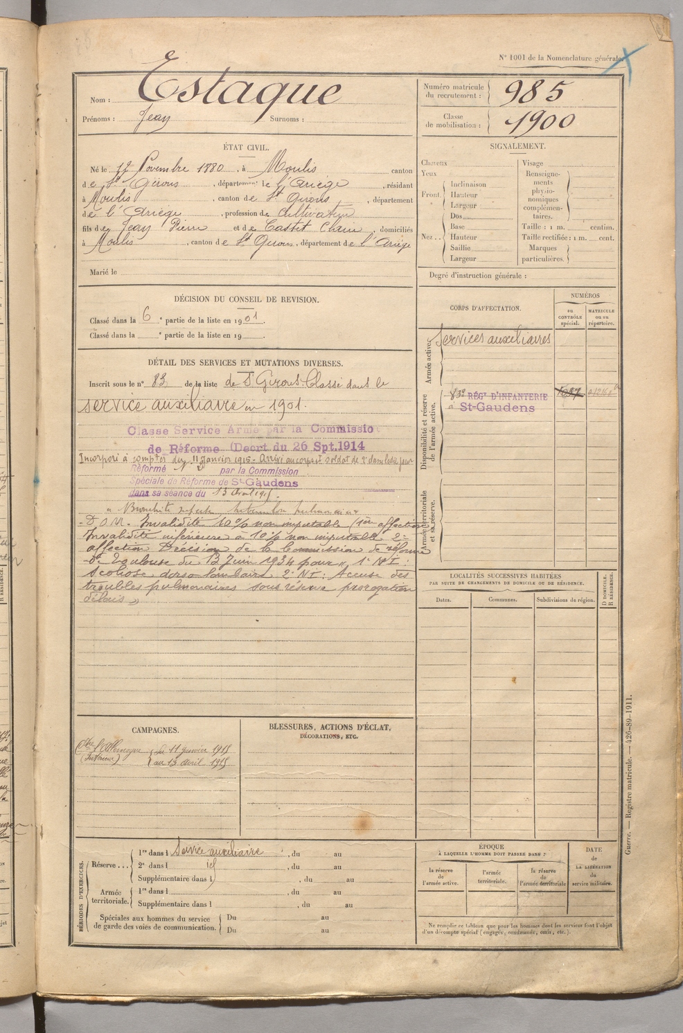 | Estaque | Jean | FOIX | 129 W 5 | 1900 | Moulis | Moulis | 985 |