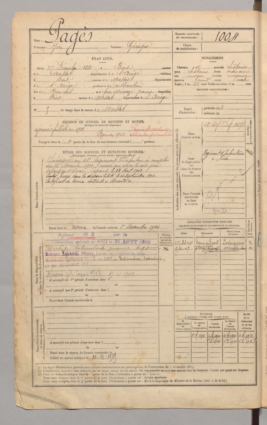 | Pagès | Jean dit Garrigue | FOIX | 129 W 4 | 1900 | Biert | Biert | 1004 |