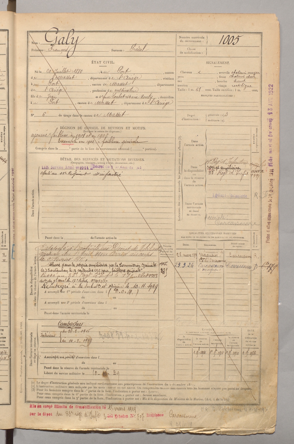 | Galy | François dit Pradal | FOIX | 129 W 4 | 1900 | Port (Le) | Port (Le) | 1005 |
