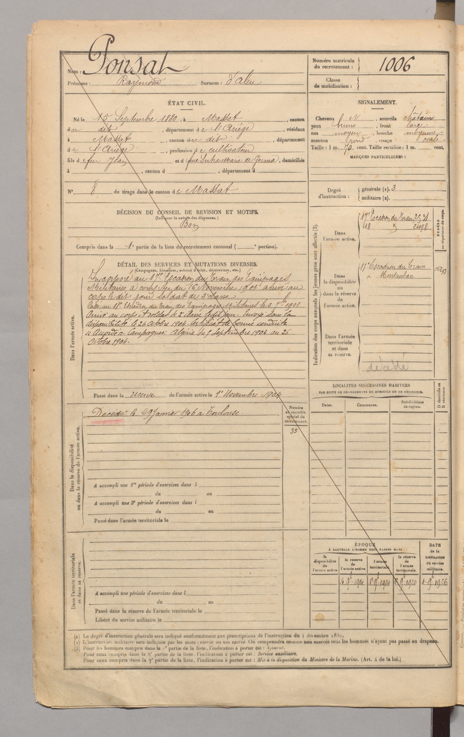| Ponsat | Raymond dit D'Aleu | FOIX | 129 W 4 | 1900 | Massat | Massat | 1006 |
