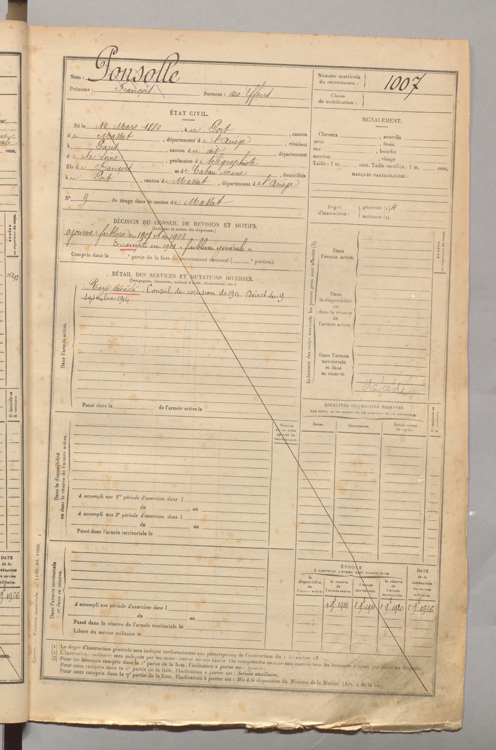 | Ponsolle | François dit des Effans | FOIX | 129 W 4 | 1900 | Port (Le) | Paris | 1007 |