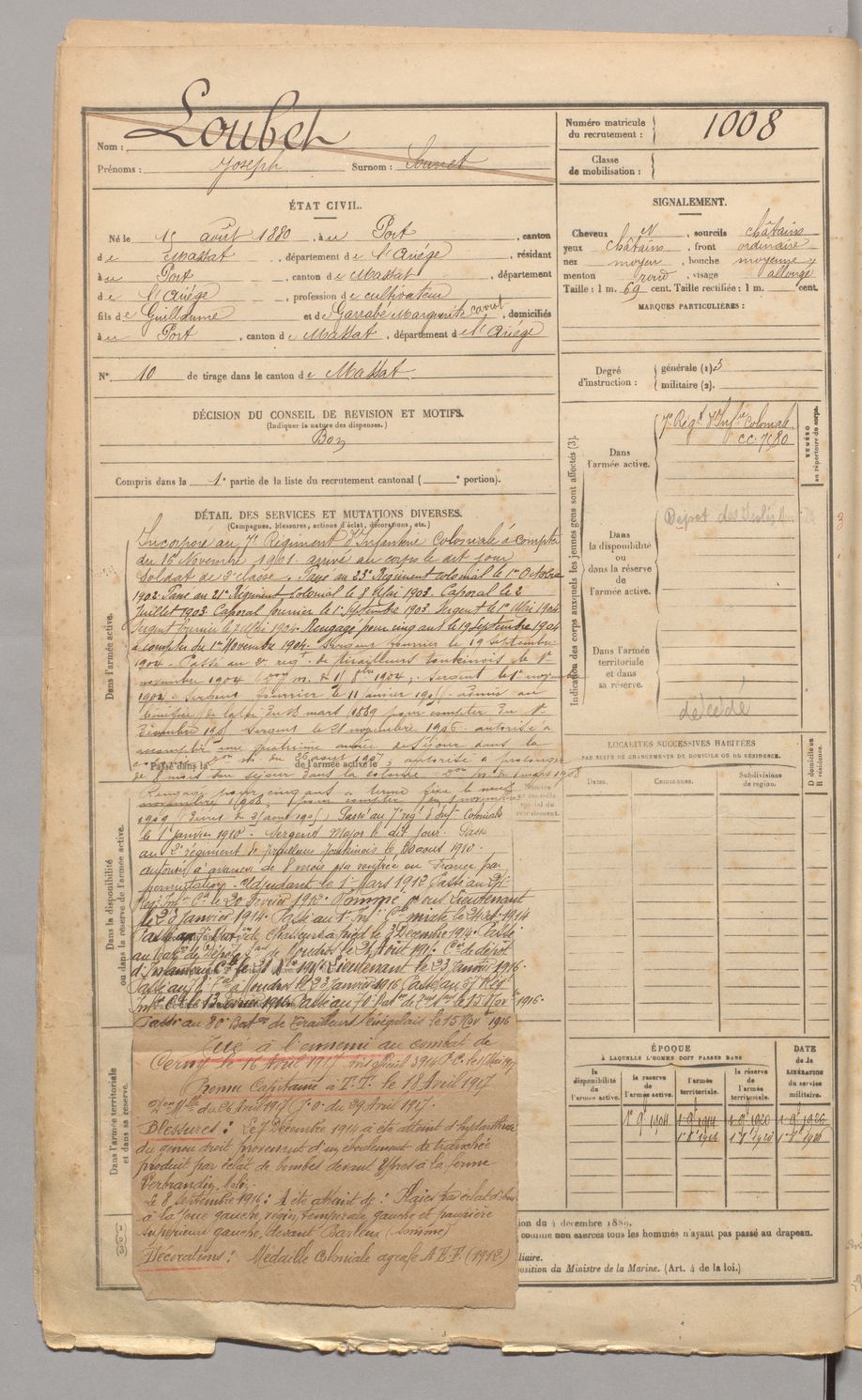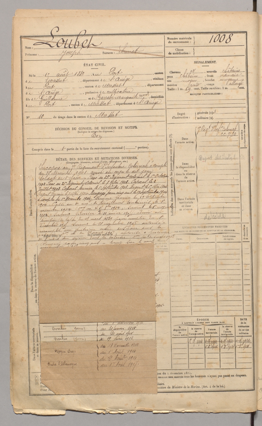 | Loubet | Joseph dit Sounet | FOIX | 129 W 4 | 1900 | Port (Le) | Port (Le) | 1008 |