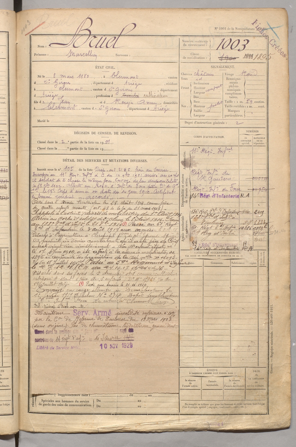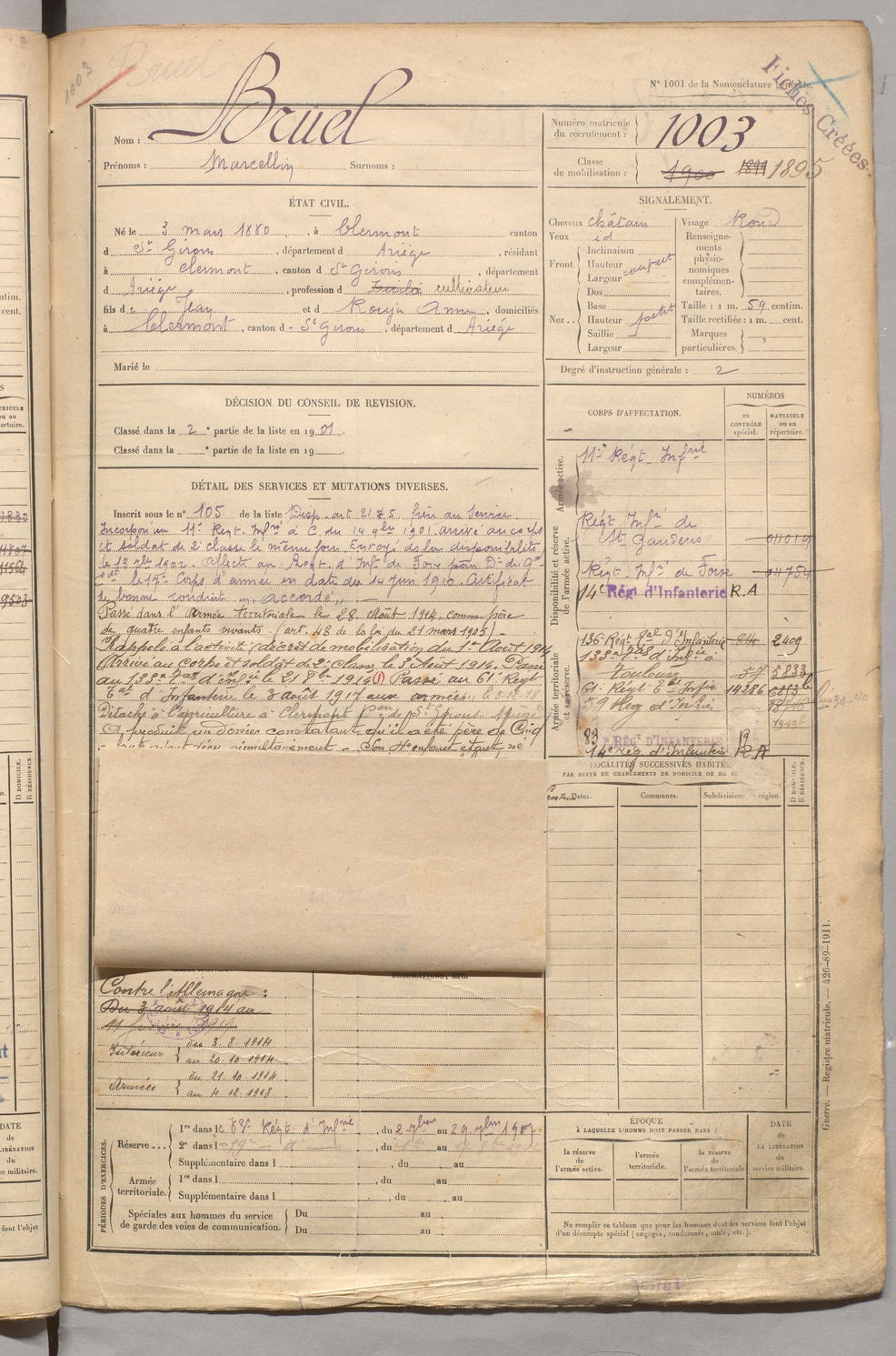 | Bruel | Marcellin | FOIX | 129 W 5 | 1900 | Clermont | Clermont | 1003 |