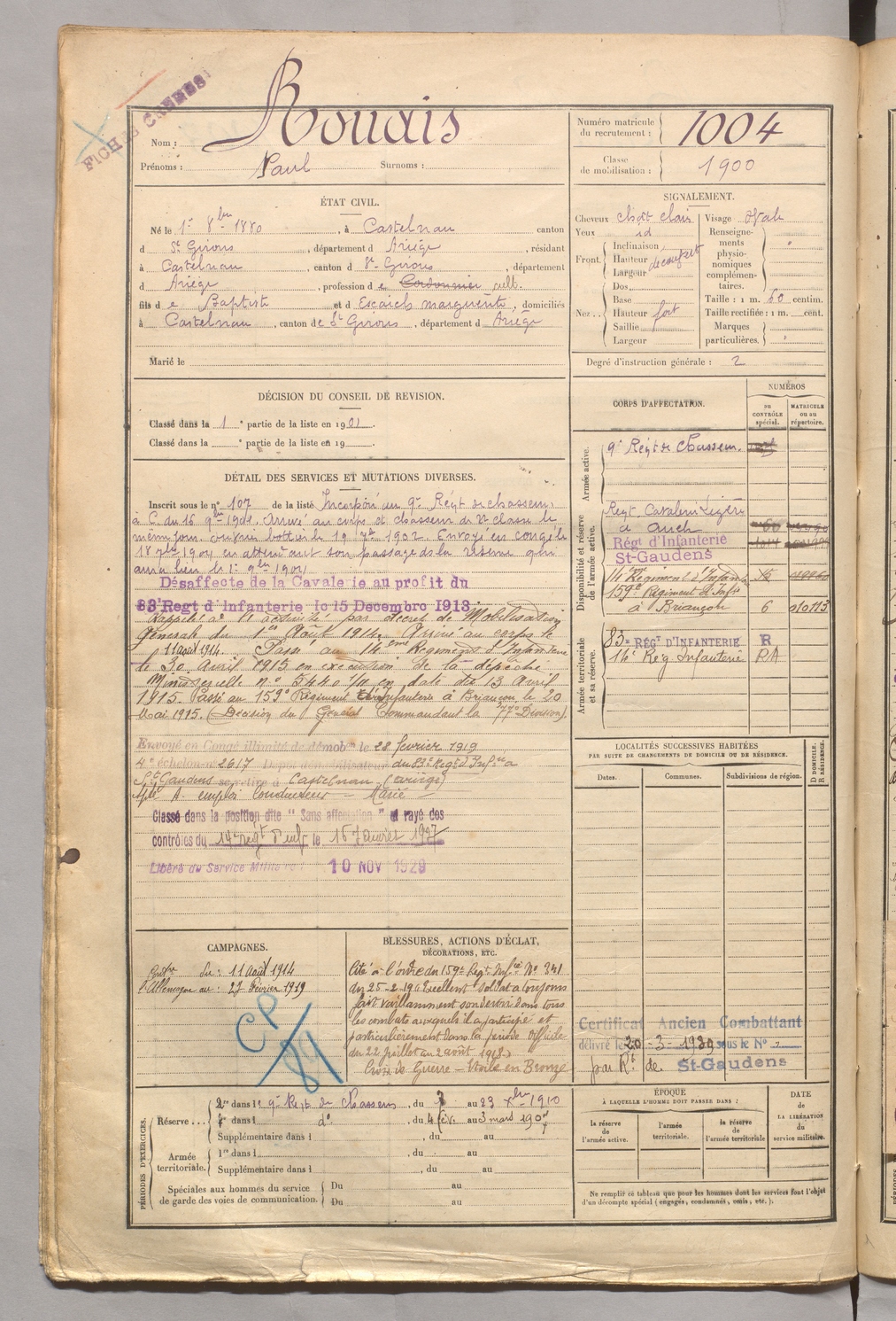 | Rouais | Paul | FOIX | 129 W 5 | 1900 | Castelnau-Durban | Castelnau-Durban | 1004 |