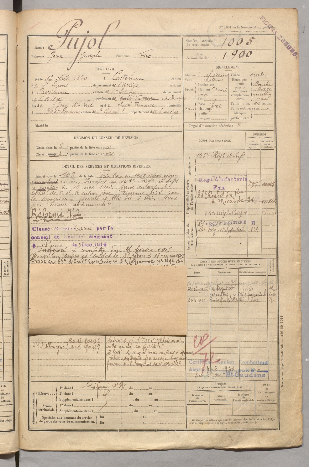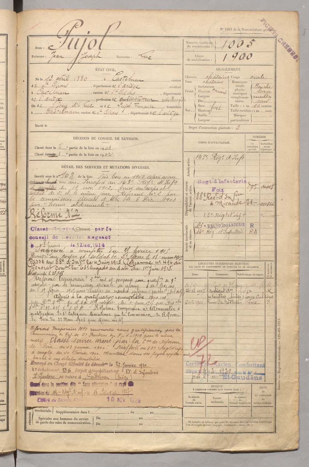 | Pujol | Jean Joseph dit Luc | FOIX | 129 W 5 | 1900 | Castelnau-Durban | Castelnau-Durban | 1005 |