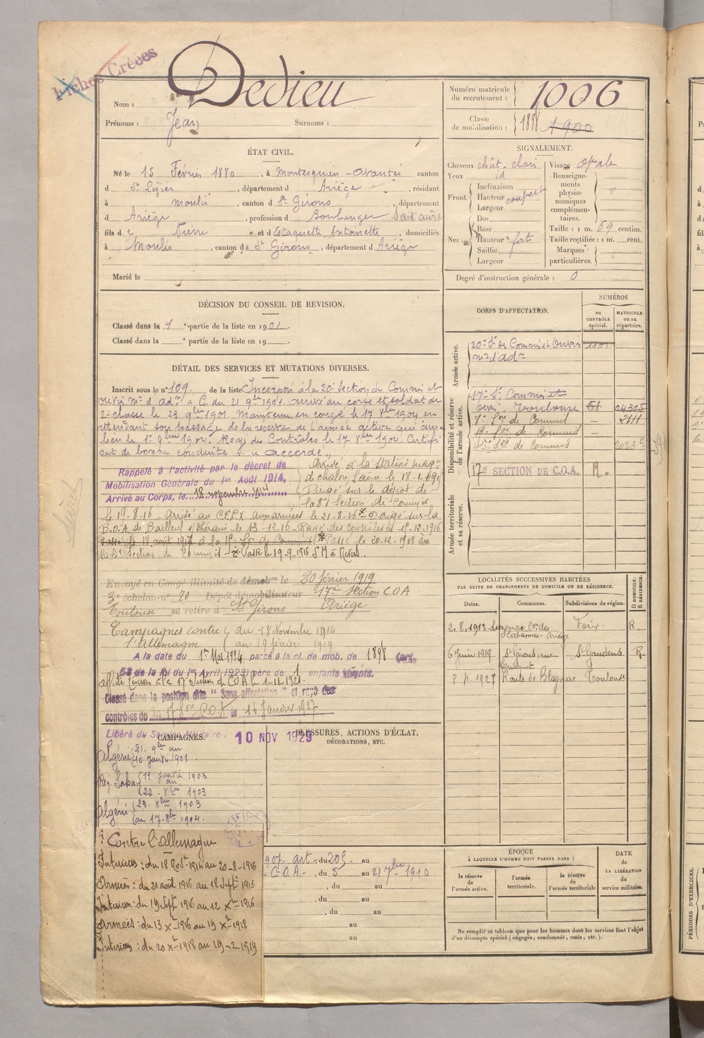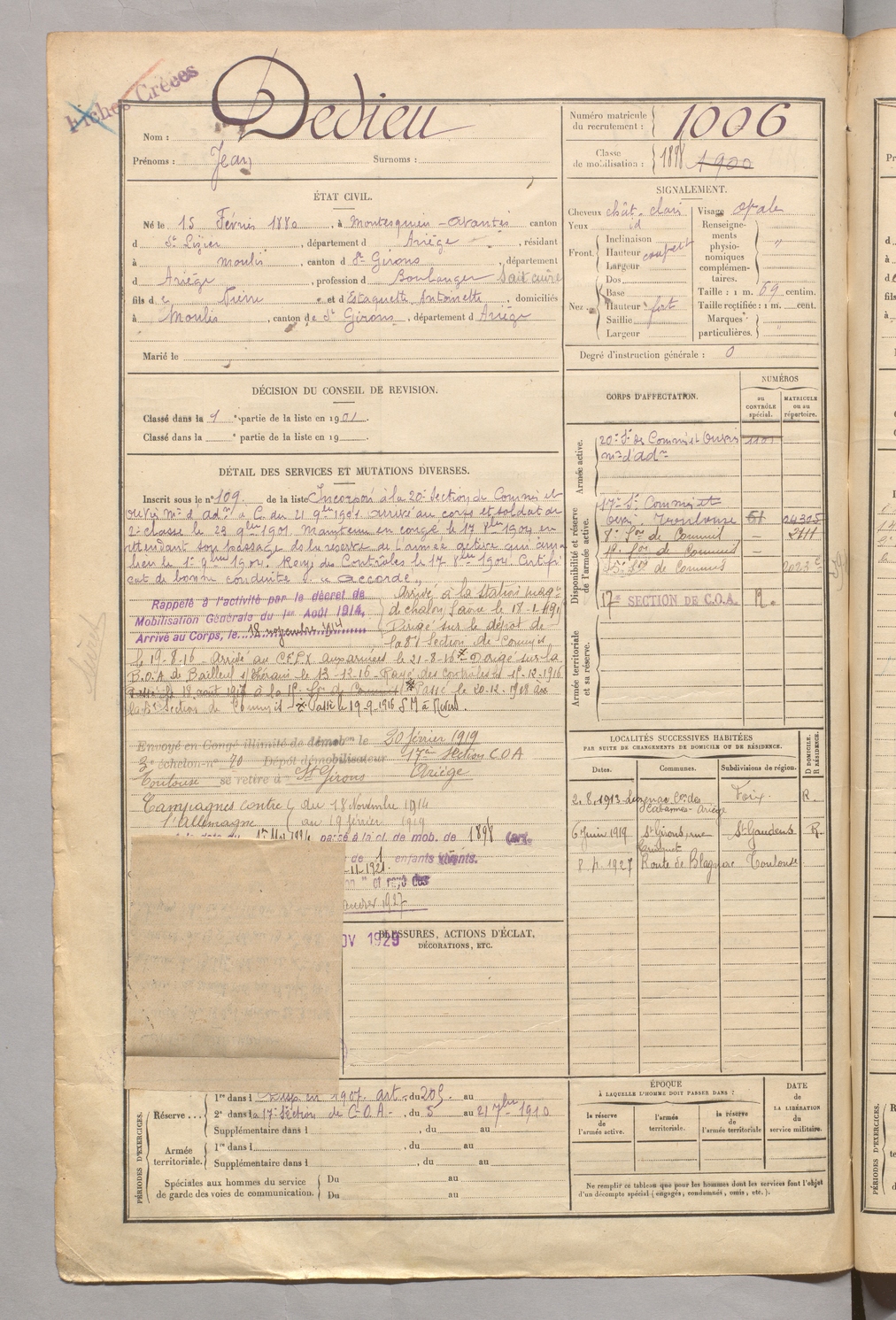 | Dedieu | Jean | FOIX | 129 W 5 | 1900 | Montesquieu-Avantès | Moulis | 1006 |