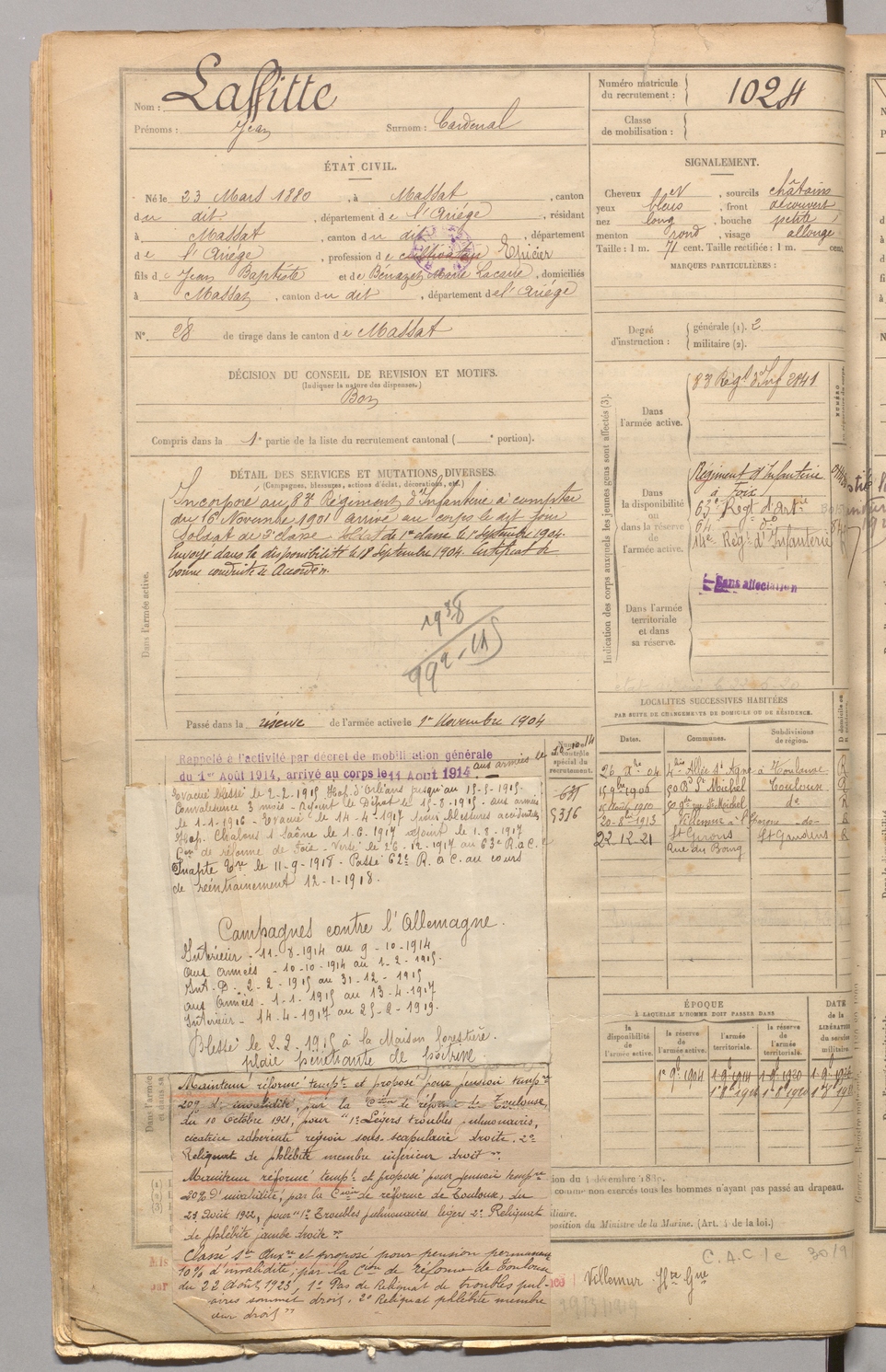| Laffitte | Jean dit Cardenal | FOIX | 129 W 4 | 1900 | Massat | Massat | 1024 |