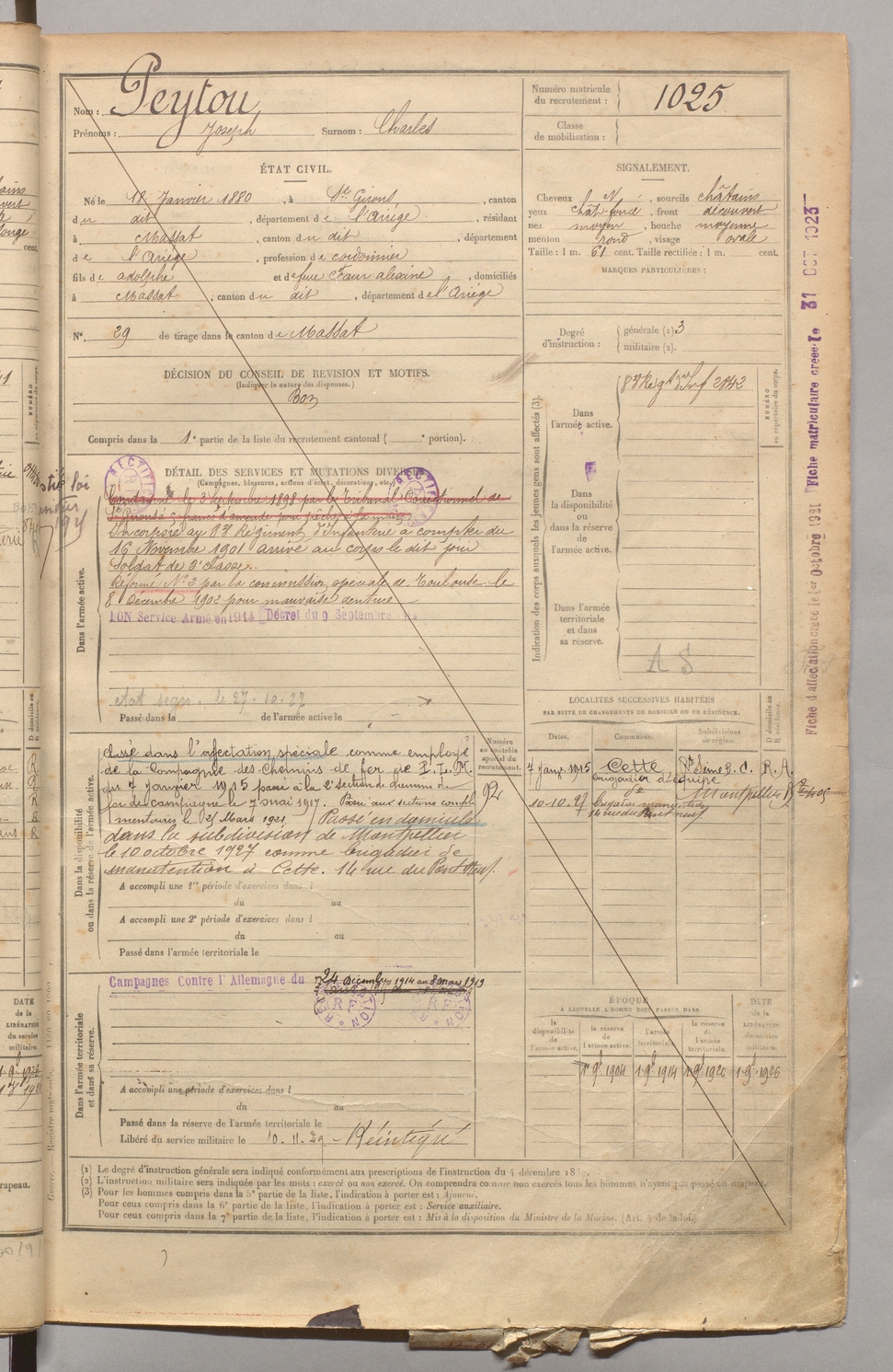 | Peytou | Joseph dit Charles | FOIX | 129 W 4 | 1900 | Saint-Girons | Massat | 1025 |