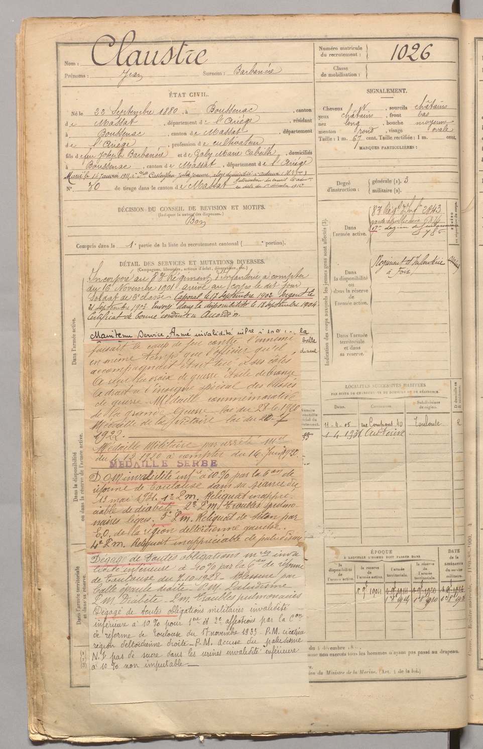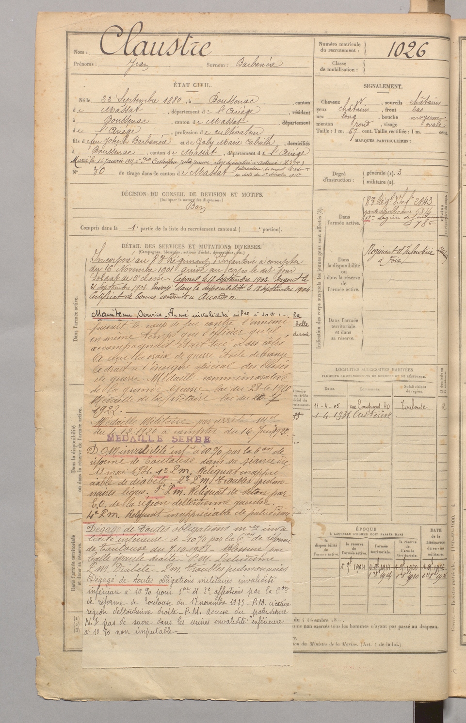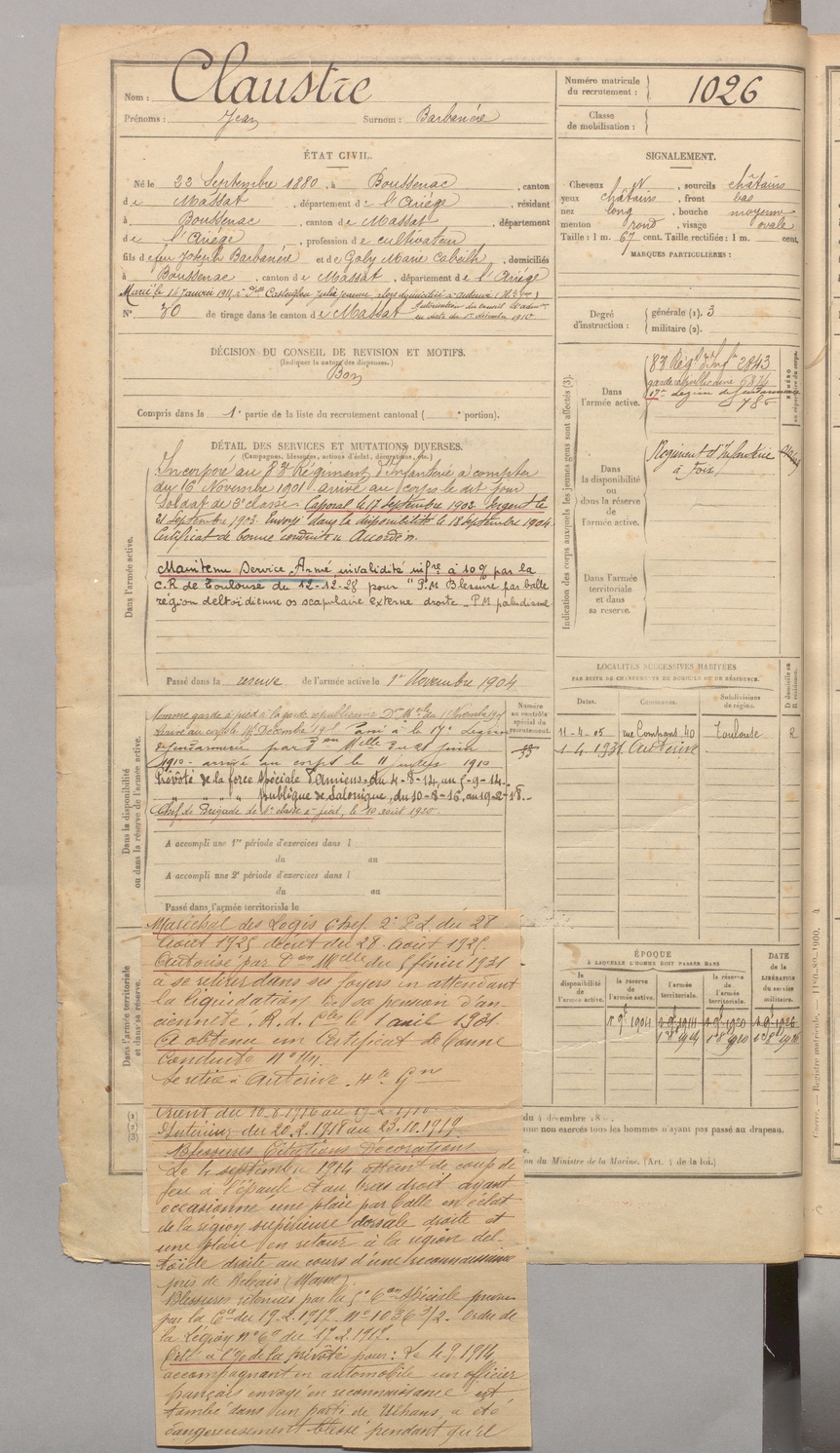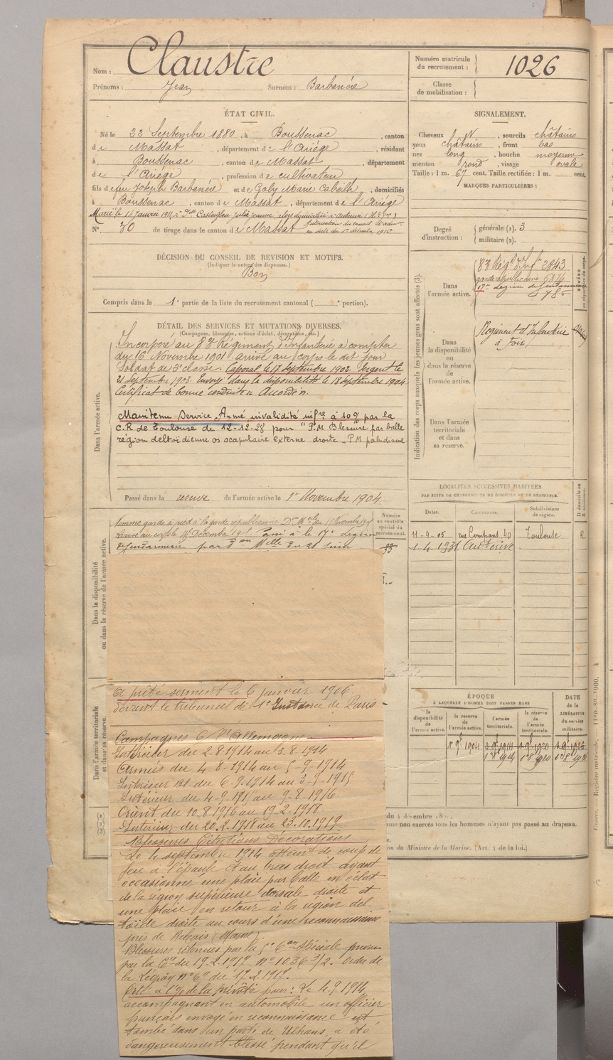 | Claustre | Jean dit Barbanère | FOIX | 129 W 4 | 1900 | Boussenac | Boussenac | 1026 |