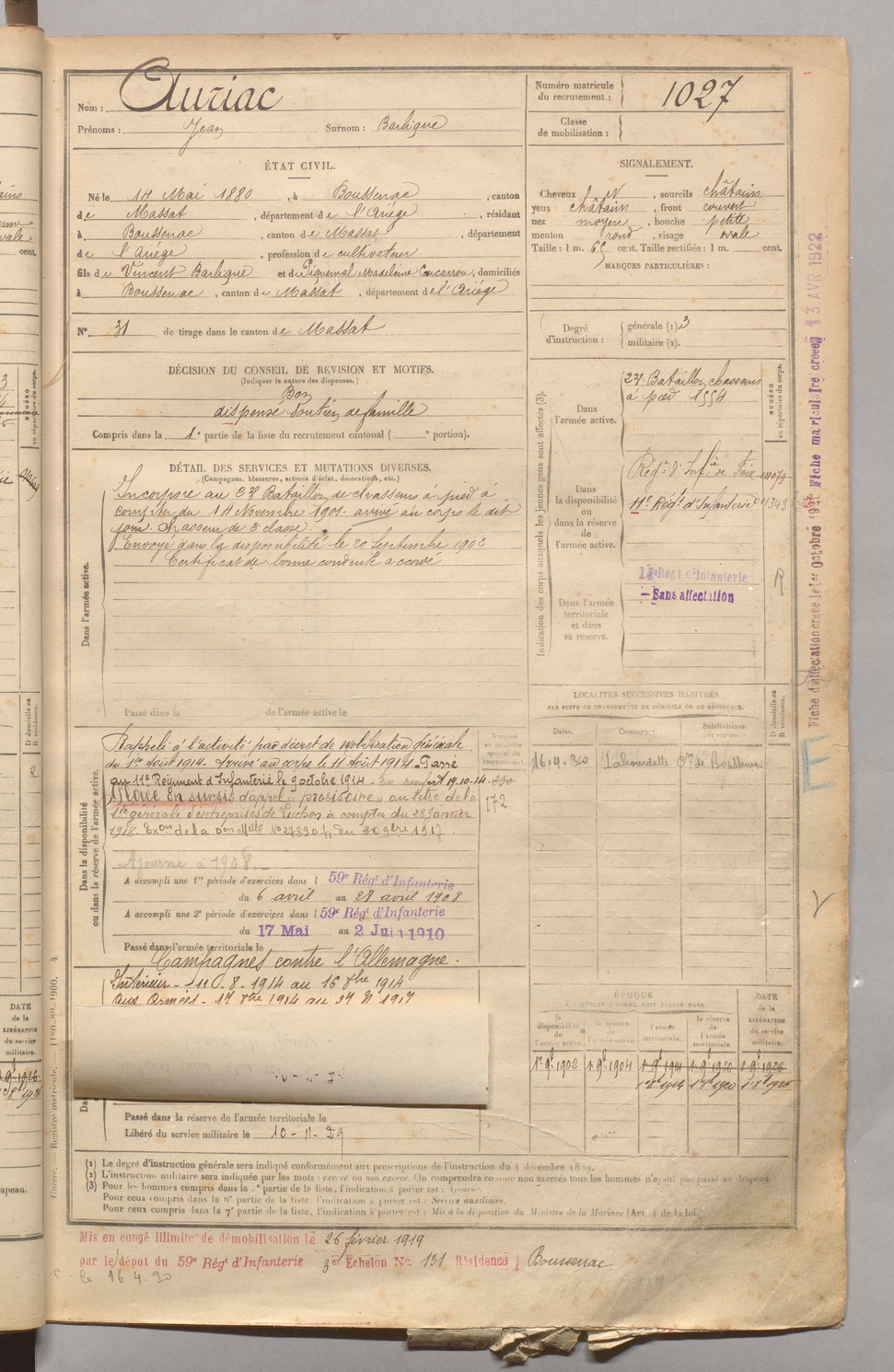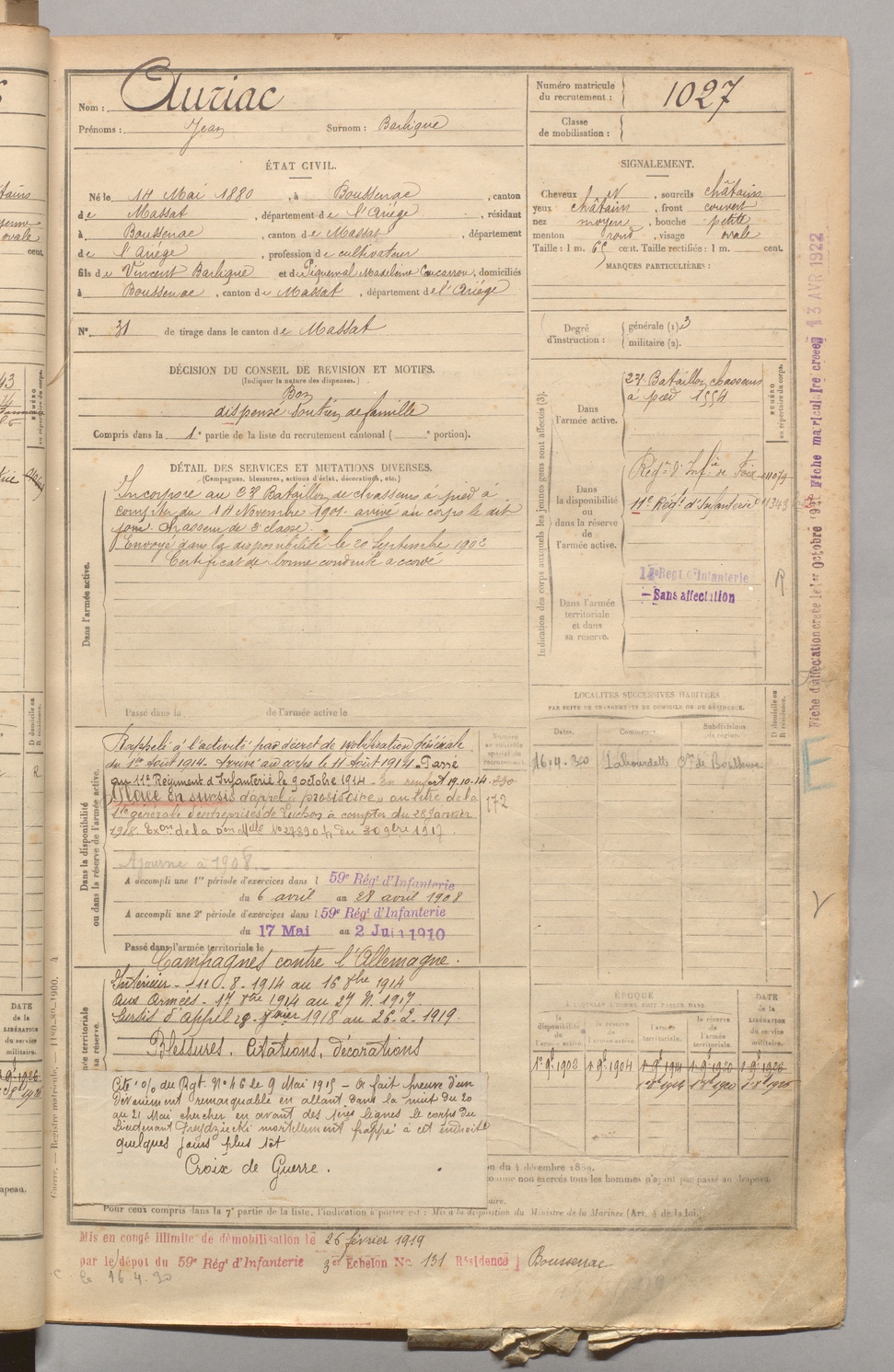 | Auriac | Jean dit Barlique | FOIX | 129 W 4 | 1900 | Boussenac | Boussenac | 1027 |