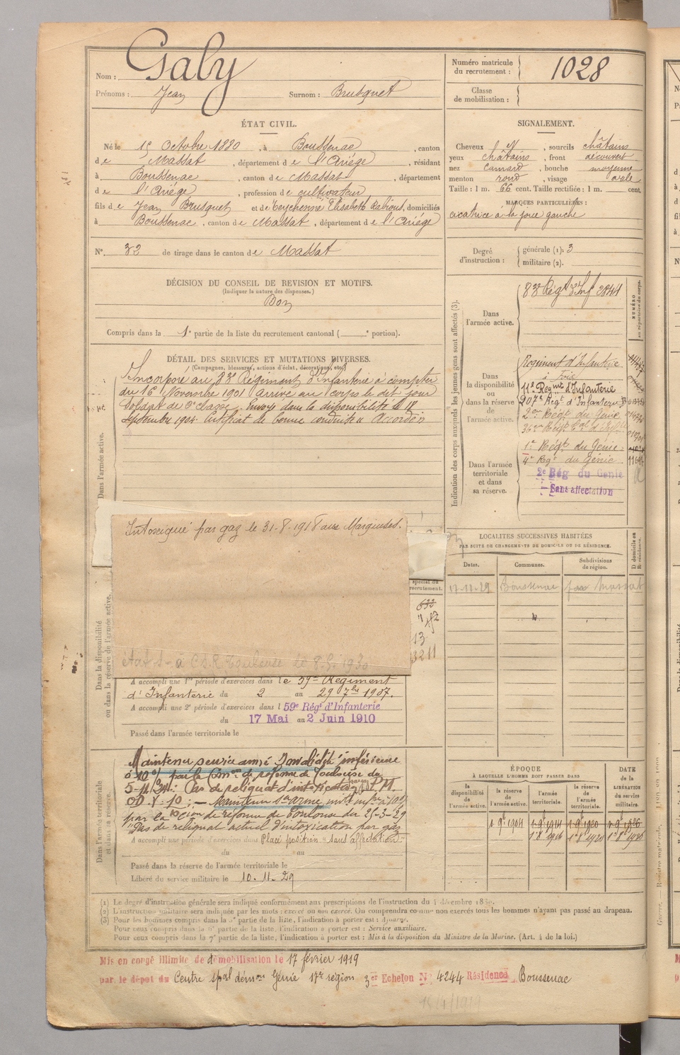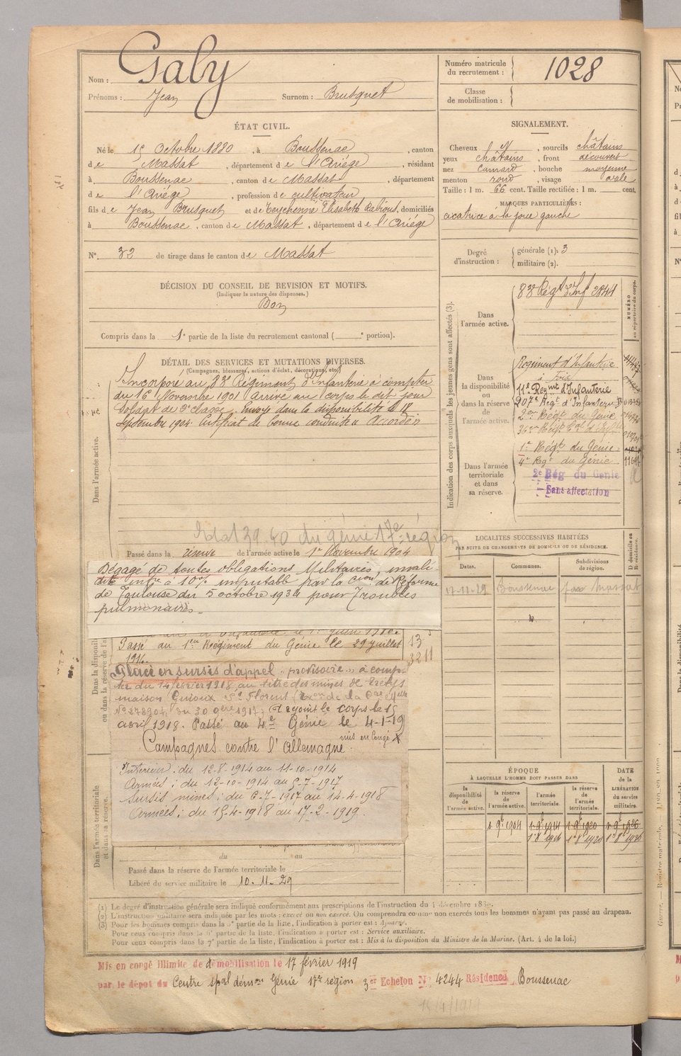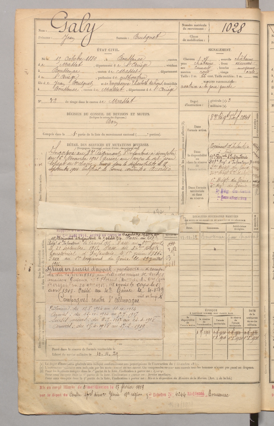 | Galy | Jean dit Brusquet | FOIX | 129 W 4 | 1900 | Boussenac | Boussenac | 1028 |