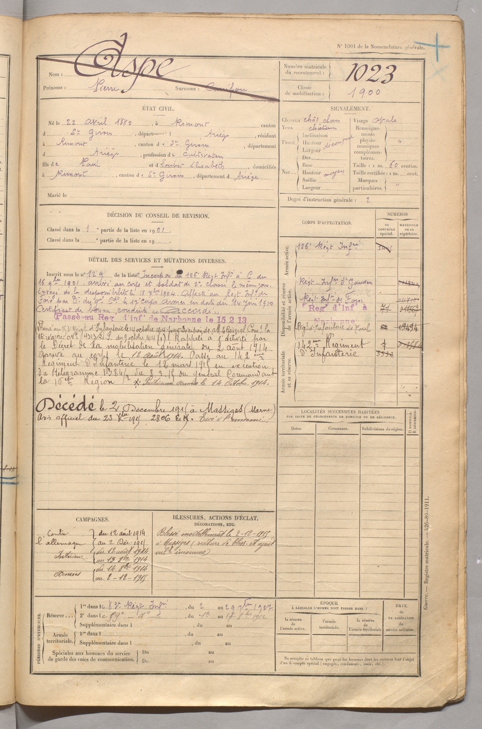 | Aspe | Pierre dit Canifou | FOIX | 129 W 5 | 1900 | Rimont | Rimont | 1023 |