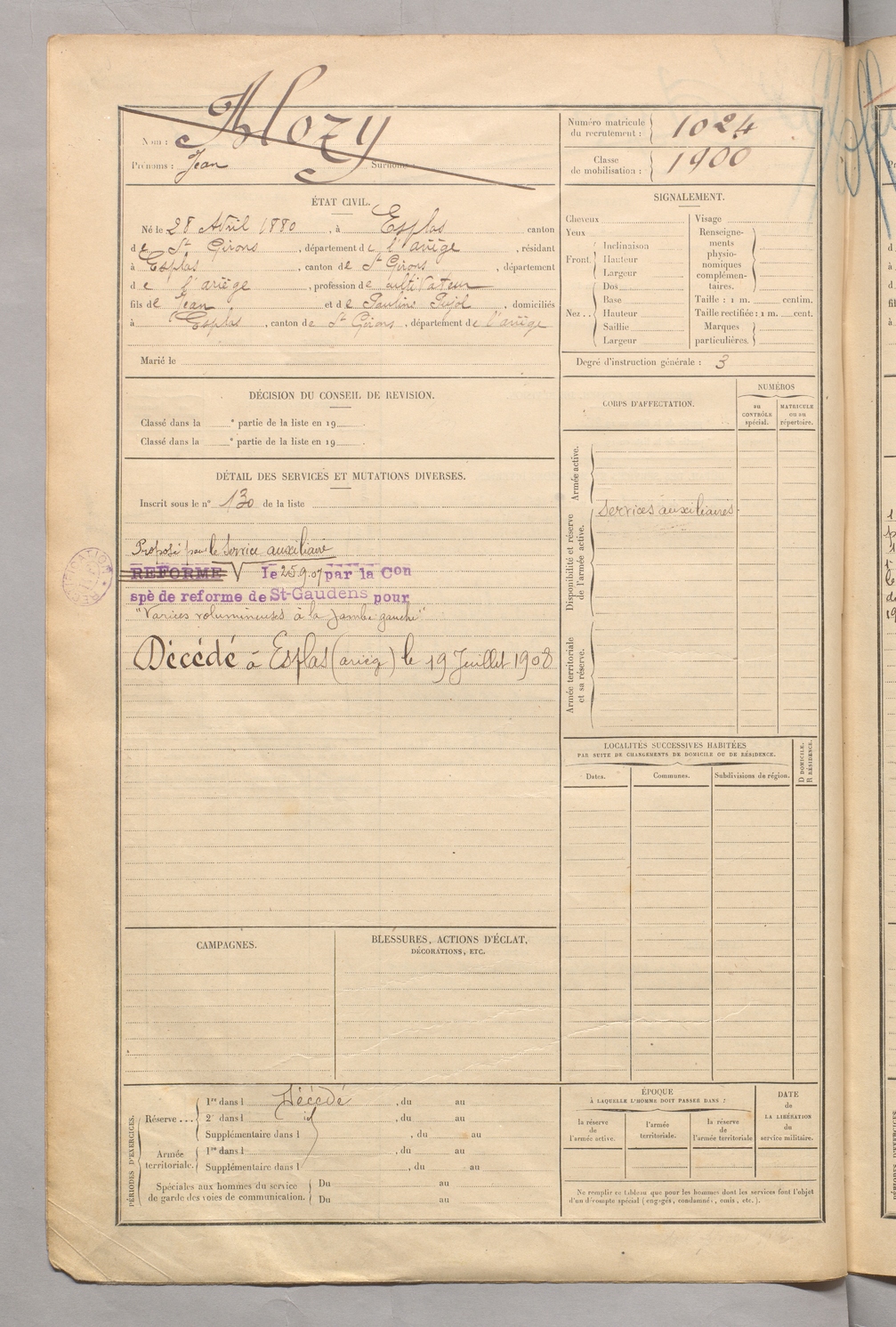 | Iblozy | Jean | FOIX | 129 W 5 | 1900 | Esplas-de-Sérou | Esplas-de-Sérou | 1024 |