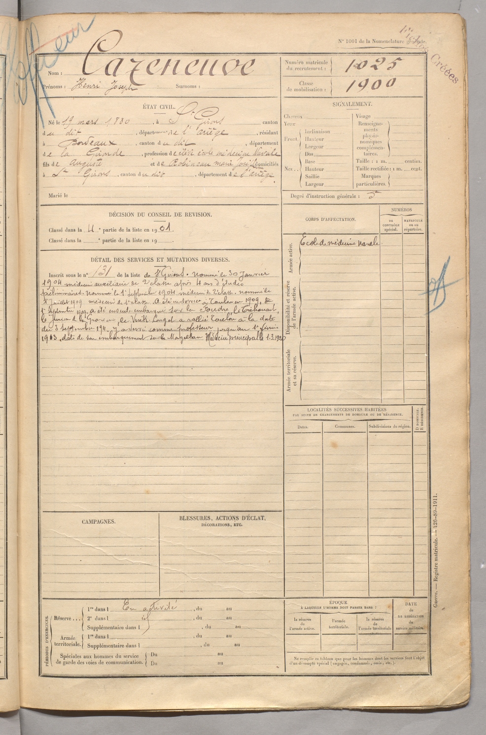| Cazeneuve | Henri Joseph | FOIX | 129 W 5 | 1900 | Saint-Girons | Bordeaux | 1025 |