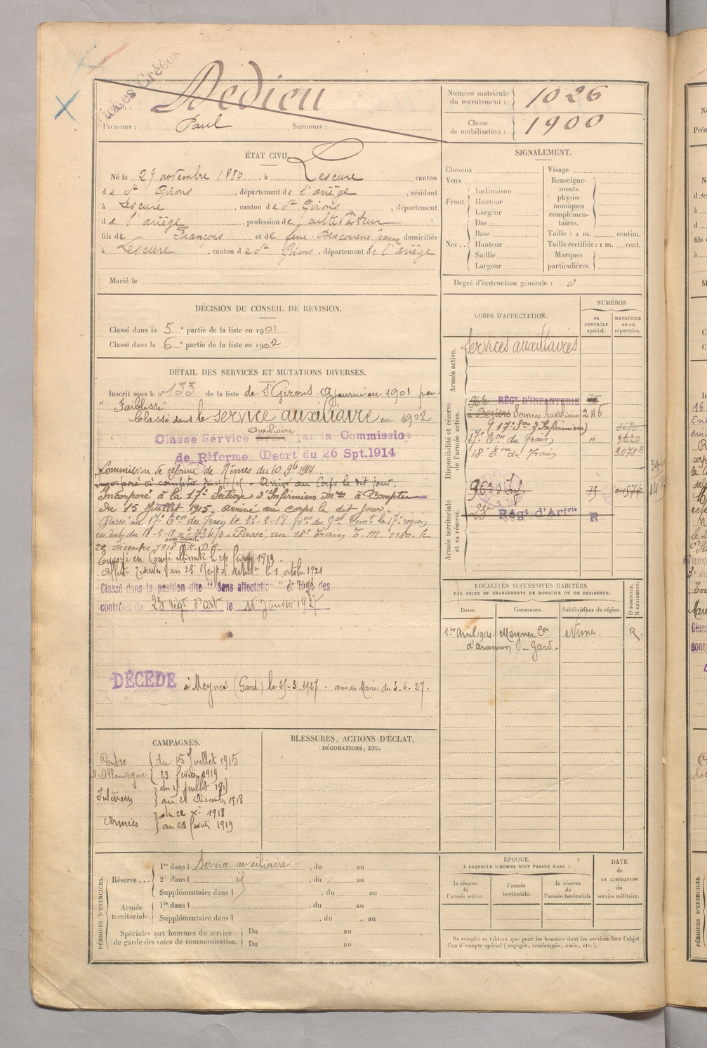 | Dedieu | Paul | FOIX | 129 W 5 | 1900 | Lescure | Lescure | 1026 |