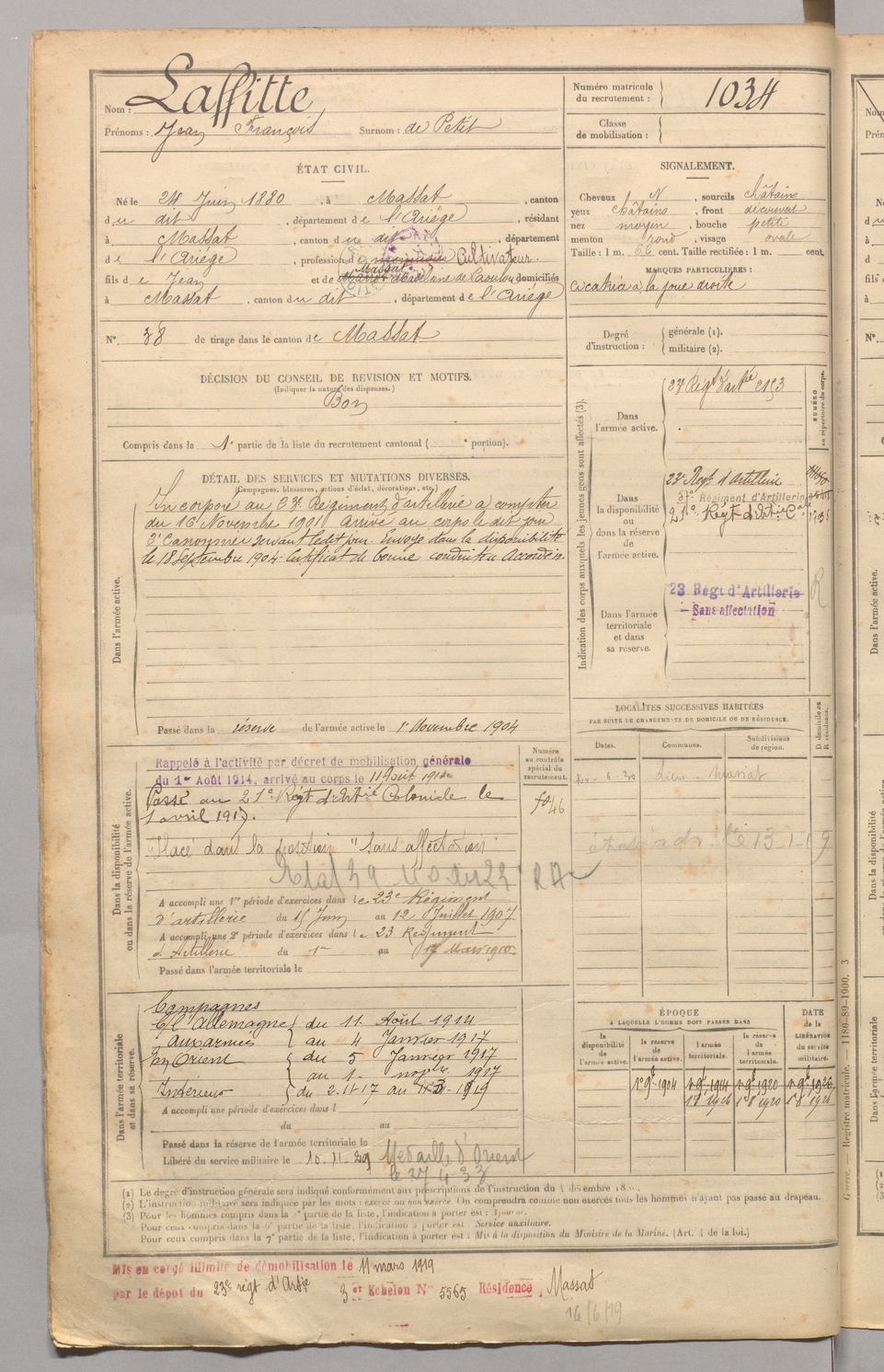 | Laffitte | Jean François dit De Petit | FOIX | 129 W 4 | 1900 | Massat | Massat | 1034 |