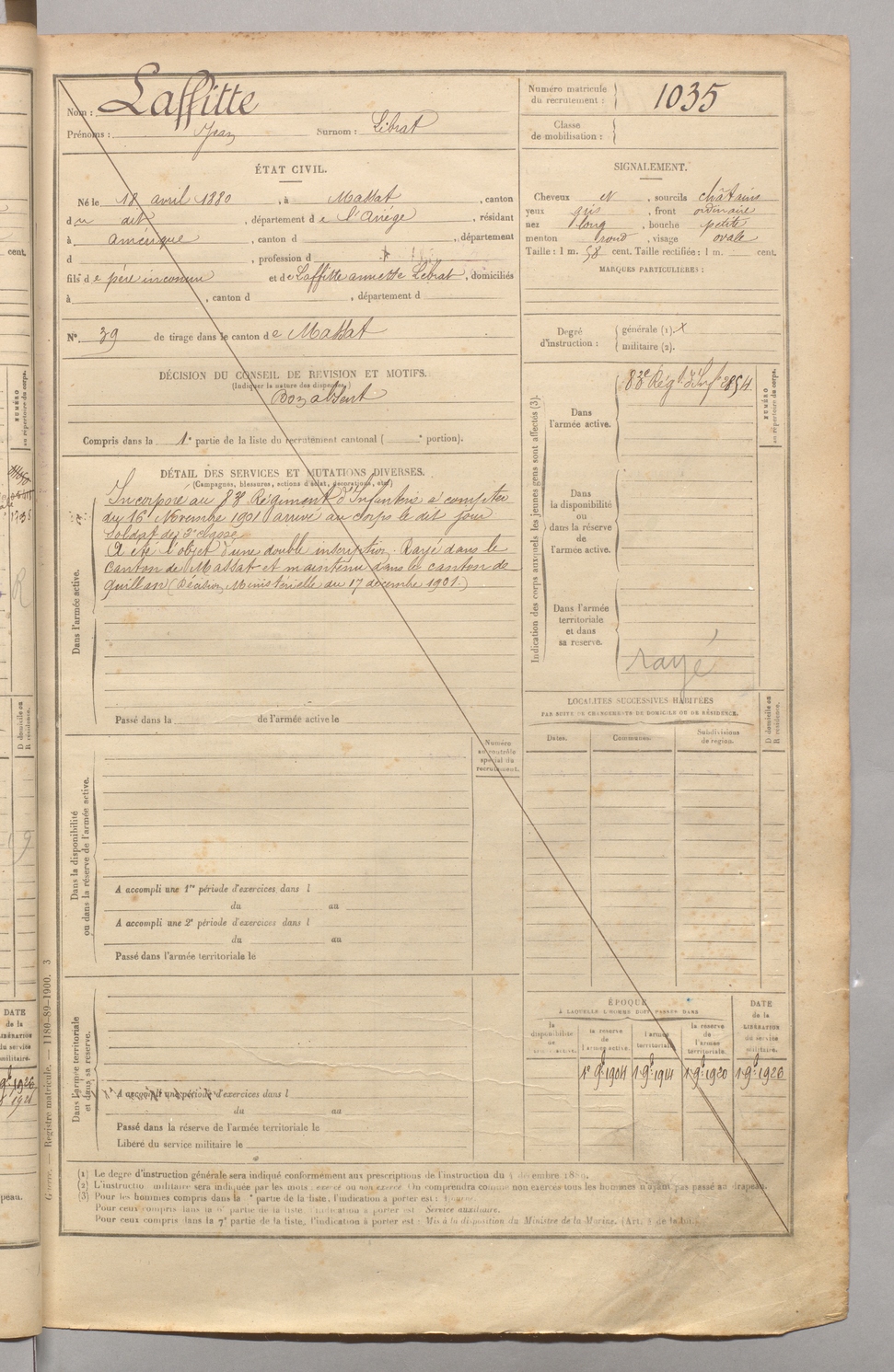 | Laffitte | Jean dit Librat | FOIX | 129 W 4 | 1900 | Massat | Amérique | 1035 |