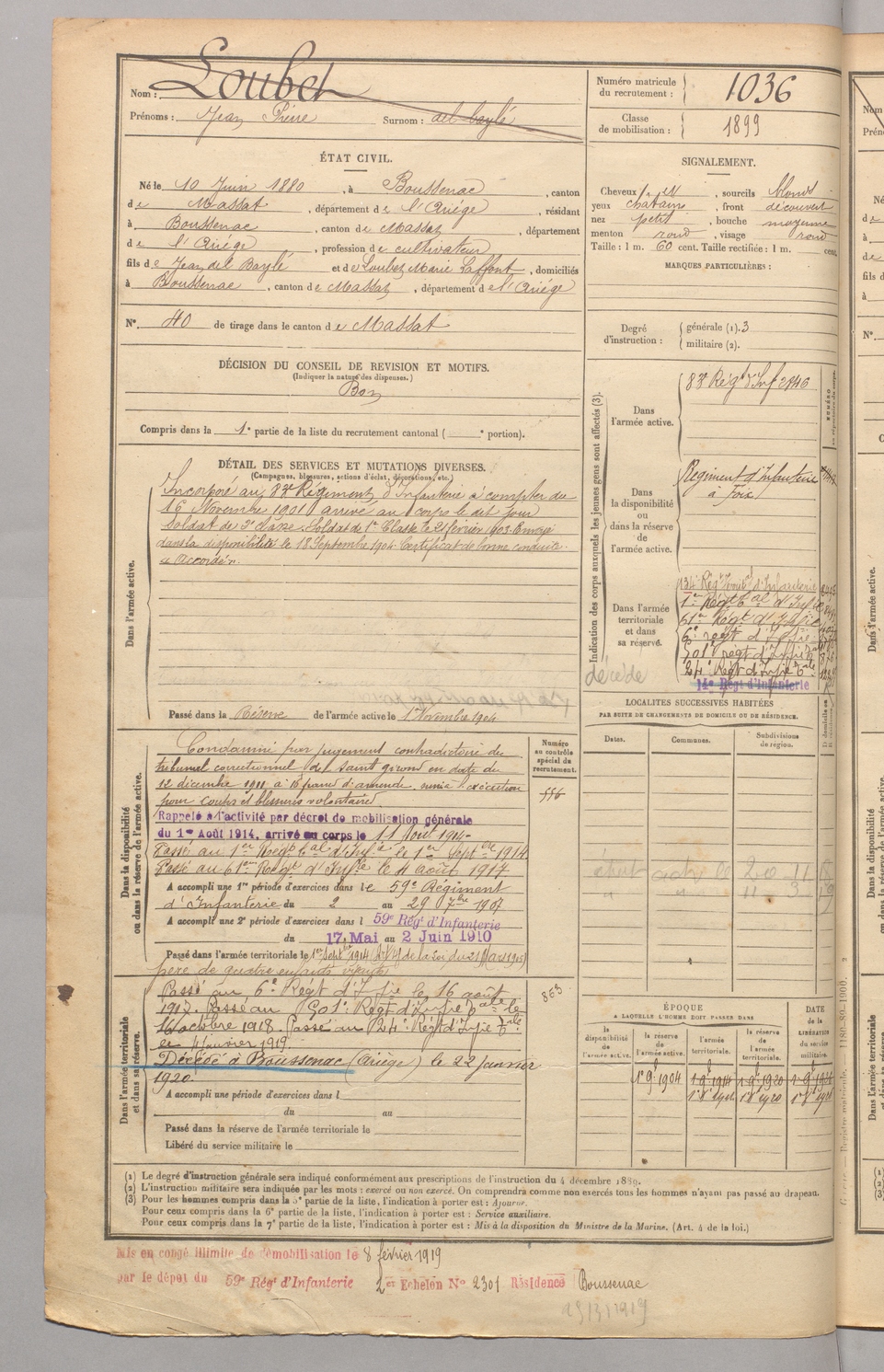 | Loubet | Jean Pierre dit Del Caylé | FOIX | 129 W 4 | 1900 | Boussenac | Boussenac | 1036 |