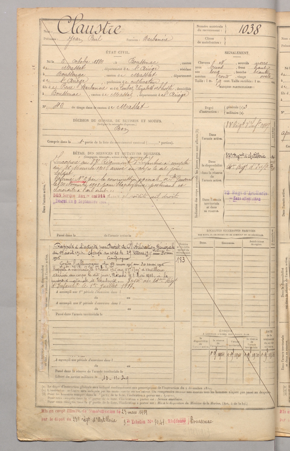 | Claustre | Jean Paul dit Barbanère | FOIX | 129 W 4 | 1900 | Boussenac | Boussenac | 1038 |