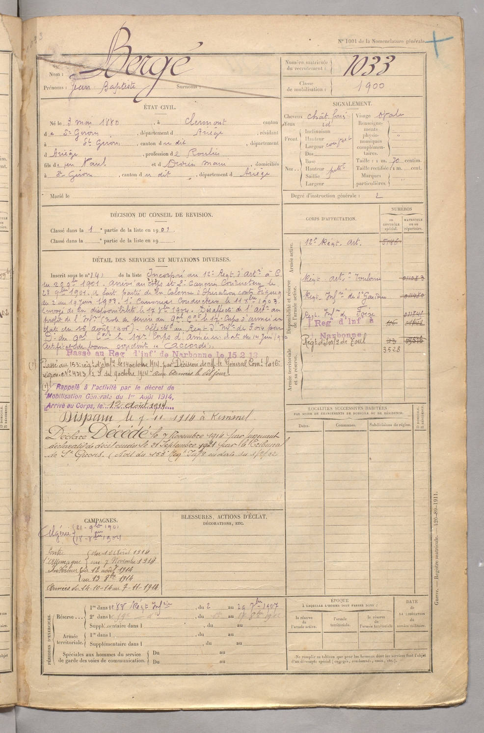 | Bergé | Jean Baptiste | FOIX | 129 W 5 | 1900 | Clermont | Saint-Girons | 1033 |