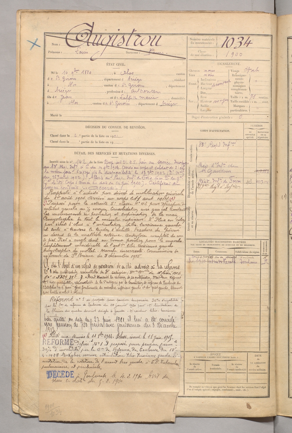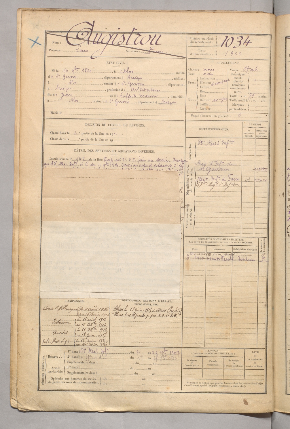 | Augistrou | Louis dit Pams | FOIX | 129 W 5 | 1900 | Alos | Alos | 1034 |