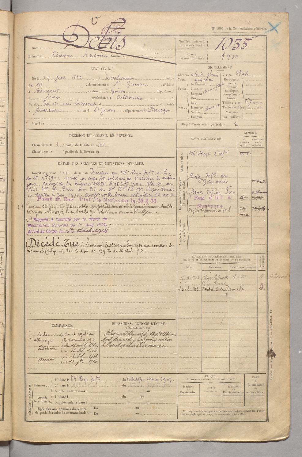 | Devis | Etienne Antoine | FOIX | 129 W 5 | 1900 | Toulouse | Rivèrenert | 1035 |