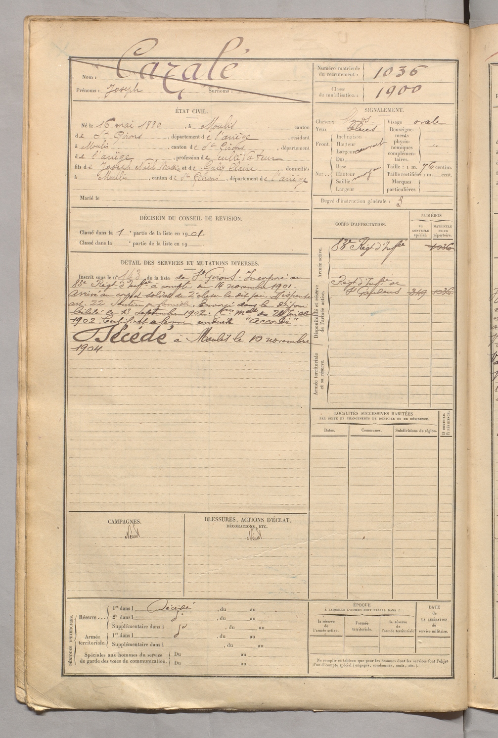| Cazalé | Joseph | FOIX | 129 W 5 | 1900 | Moulis | Moulis | 1036 |