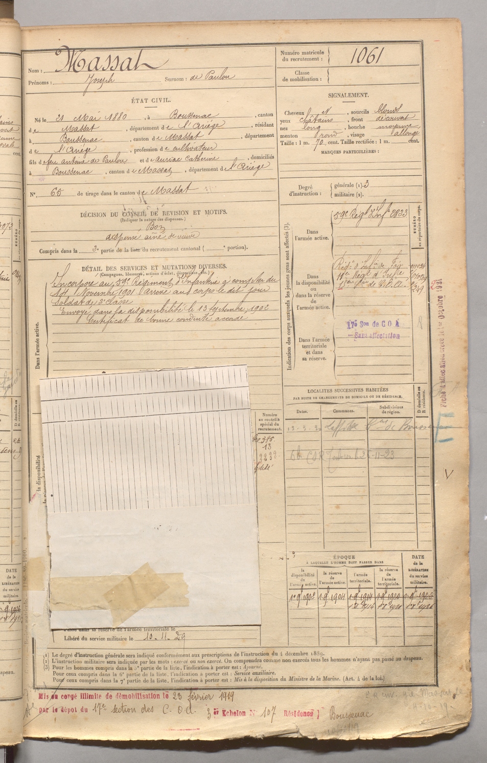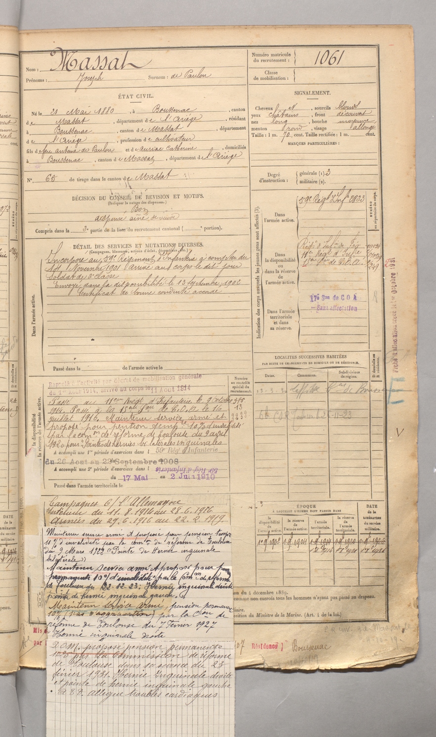 | Massat | Joseph dit De Paulou | FOIX | 129 W 4 | 1900 | Boussenac | Boussenac | 1061 |